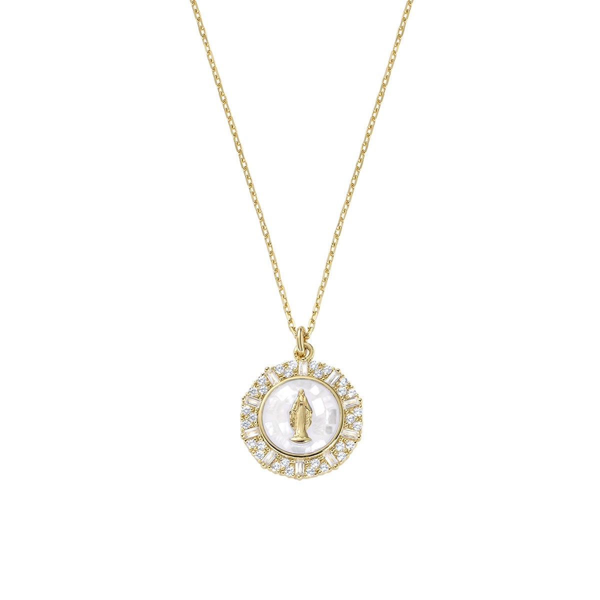Una Madonna Miracolosa dolcissima, fonte di conforto e protezione, su sfondo in delicata madreperla bianca cangiante e halo di zirconi.
