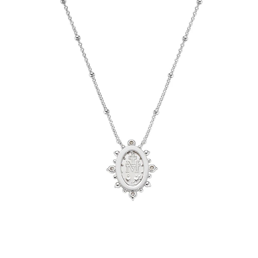 Collana donna amen, OTCLMIRABBZ, collezione miracolosa, in ottone rodiato, catena a palline e zirconi bianchi. La medaglia Miracolosa ovale è illuminata da quattro zirconi che ne esaltano la raffinata bellezza e omaggiano la luce della Fede e della devozione mariana. Sul retro, è presente la tradizione iconografia della Miracolosa. Lunghezza regolabile da 40 a 45 cm, dimensioni della medaglia: 1, 8 x 1, 4 cm