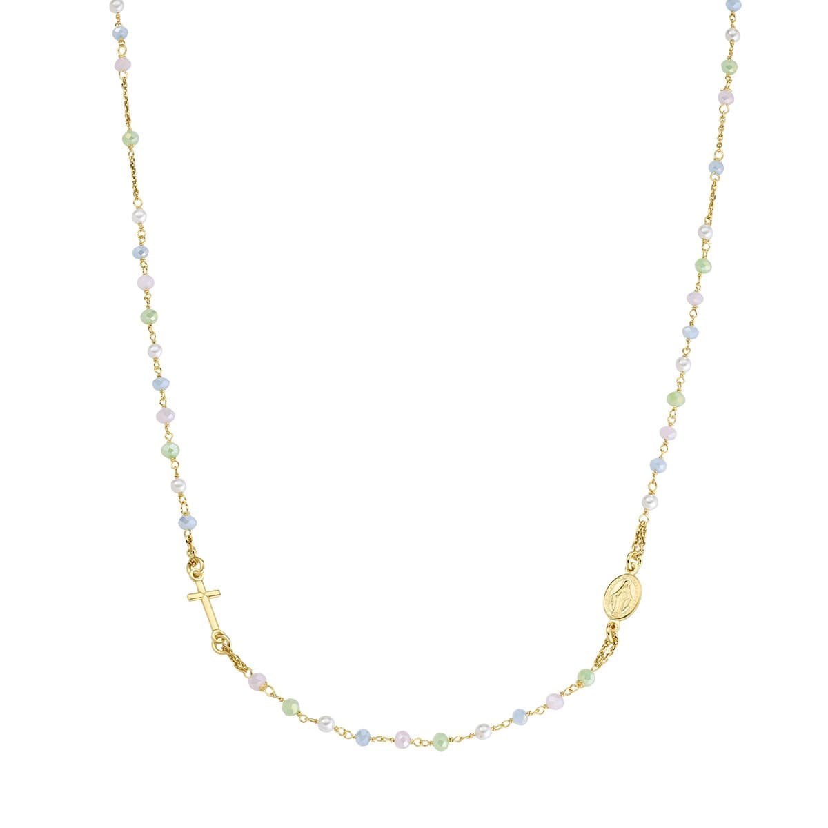 Collana donna amen, CROGMA3, collezione sacro, Rosario girocollo in argento 925 con grani da 3 mm di cristalli sfaccettati rosa, verdi e azzurro pastello alternati a perle di cristallo bianche, croce e medaglietta rappresentante la Madonna Miracolosa.