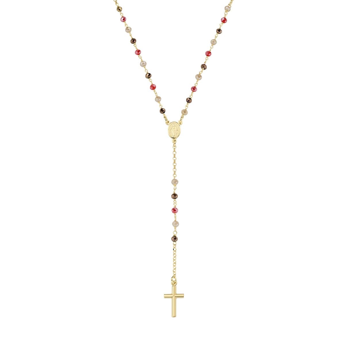 Collana donna amen, CROGMM4, collezione sacro, Rosario classico in argento 925 grani da 3 mm di cristalli sfaccettati marroni, grigi e rosso corallo, croce e medaglietta rappresentante la Madonna Miracolosa.