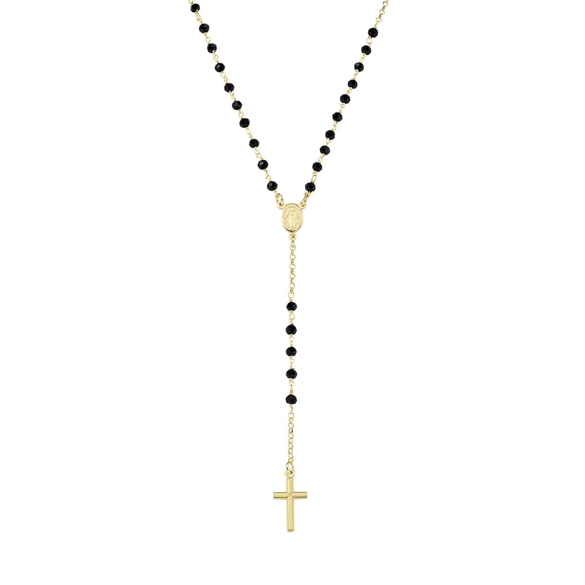 Collana donna amen, CROGN4, collezione sacro, Rosario classico in argento 925 con grani da 3 mm di cristalli neri sfaccettati, croce e medaglietta rappresentante la Madonna Miracolosa.