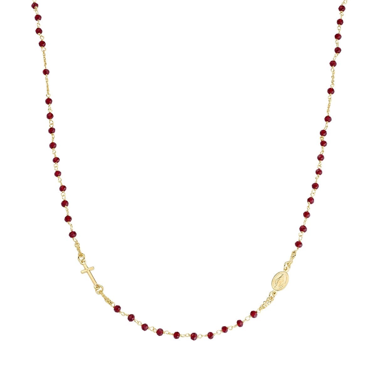 Collana donna amen, CROGR3, collezione sacro, in argento 925 con grani da 3 mm di cristalli rossi sfaccettati, croce e medaglietta rappresentante la Madonna Miracolosa.