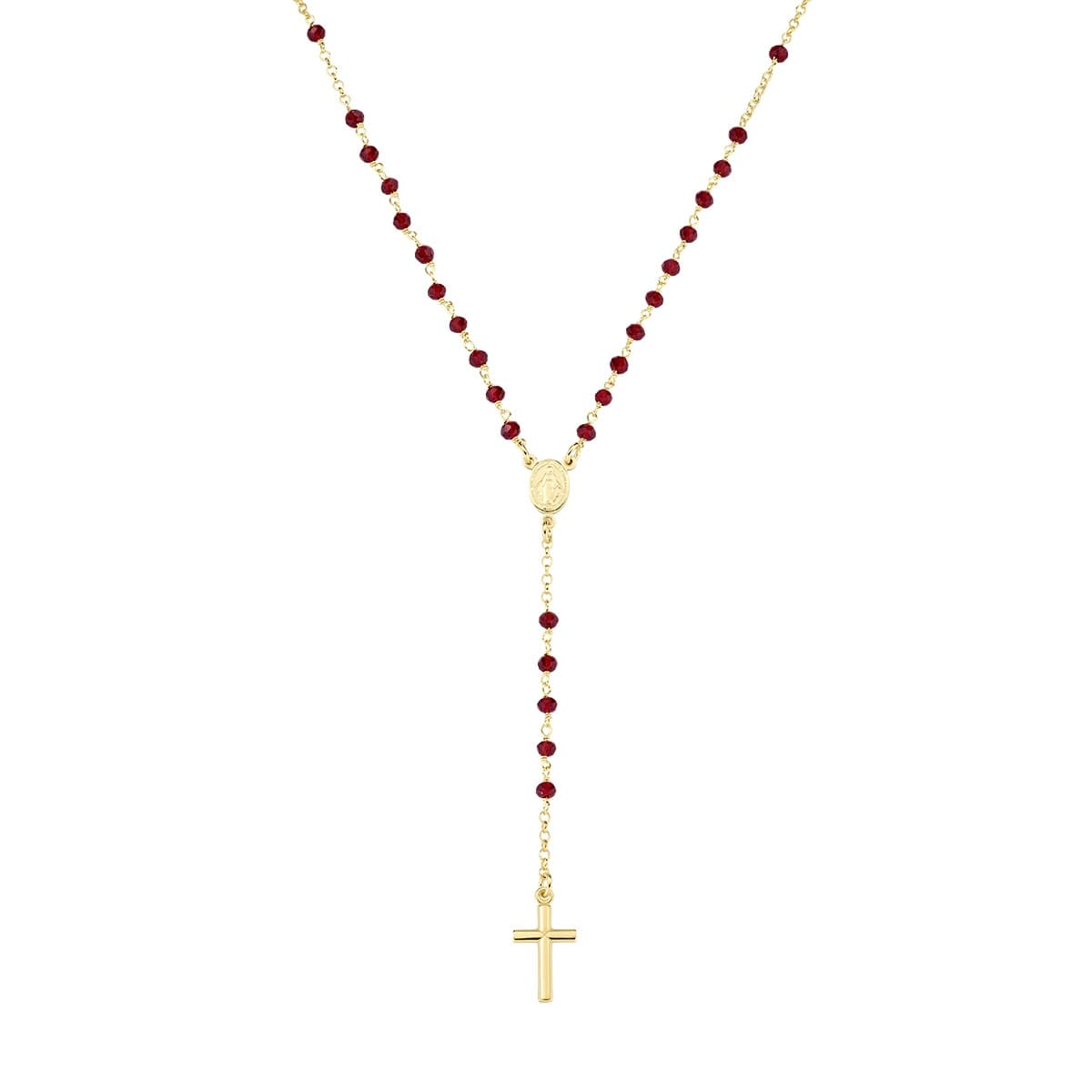 Collana donna amen, CROGR4, collezione sacro, rosario in argento dorato con grani da 3 mm di cristalli rossi sfaccettati, croce e medaglietta rappresentante la Madonna Miracolosa. lunghezza regolabile da 48 a 50 cm con chiusura a moschettone e catenina di allungo.