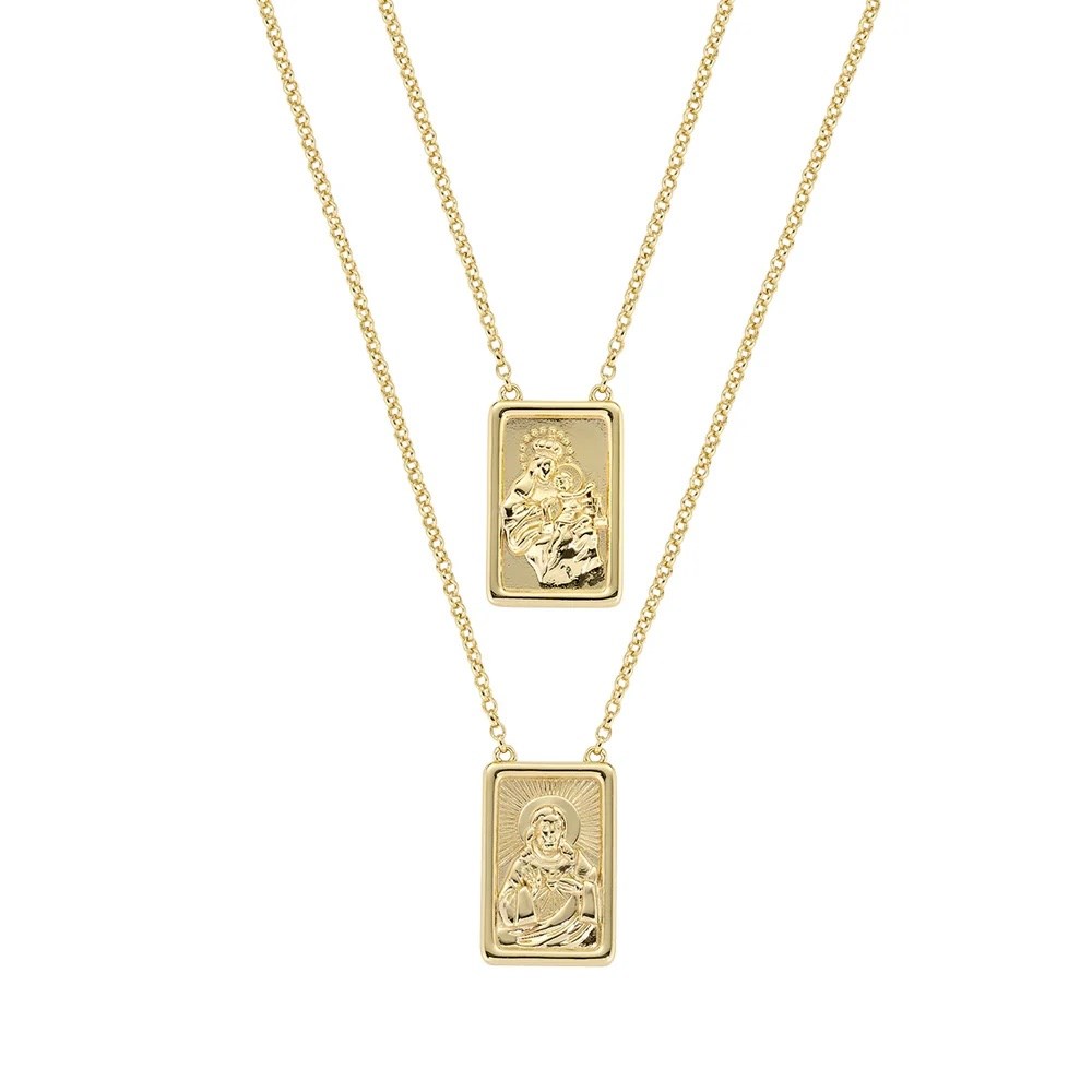 Collana donna amen, OTSCAMAGEG, collezione sacro, in ottone placcato oro 18kt con doppia medaglia raffigurante la Madonna col Bambino e il Sacro Cuore di Gesù. Le medaglie hanno dimensione 1 x 1, 5 cm e la lunghezza totale dello scapolare è 80 cm