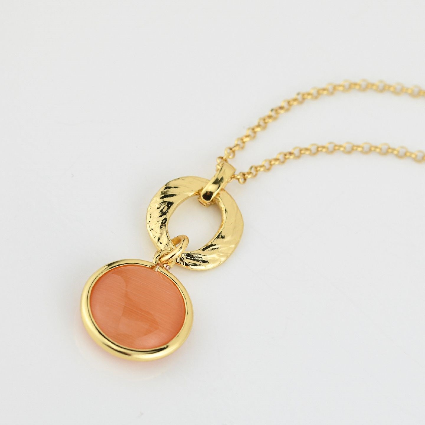 Collana donna boccadamo, XGR736DO, collezione crisette, in bronzo placcata oro giallo con pendente composto da un modulo circolare martellato e da un cristallo effetto cabochon di colore arancio scuro. Misure: lunghezza cm 39, estendibile fino a cm 44, 5 Dimensione: cristalli cm 1, 5