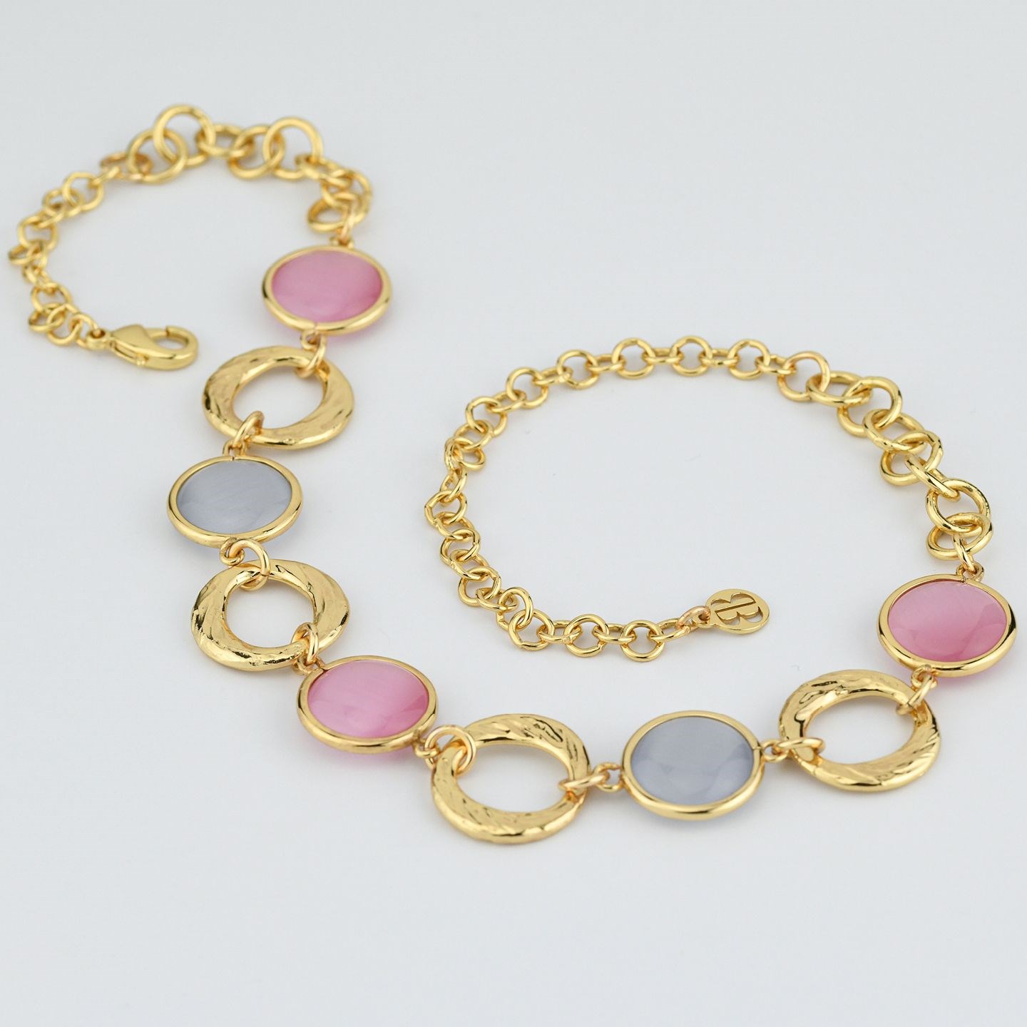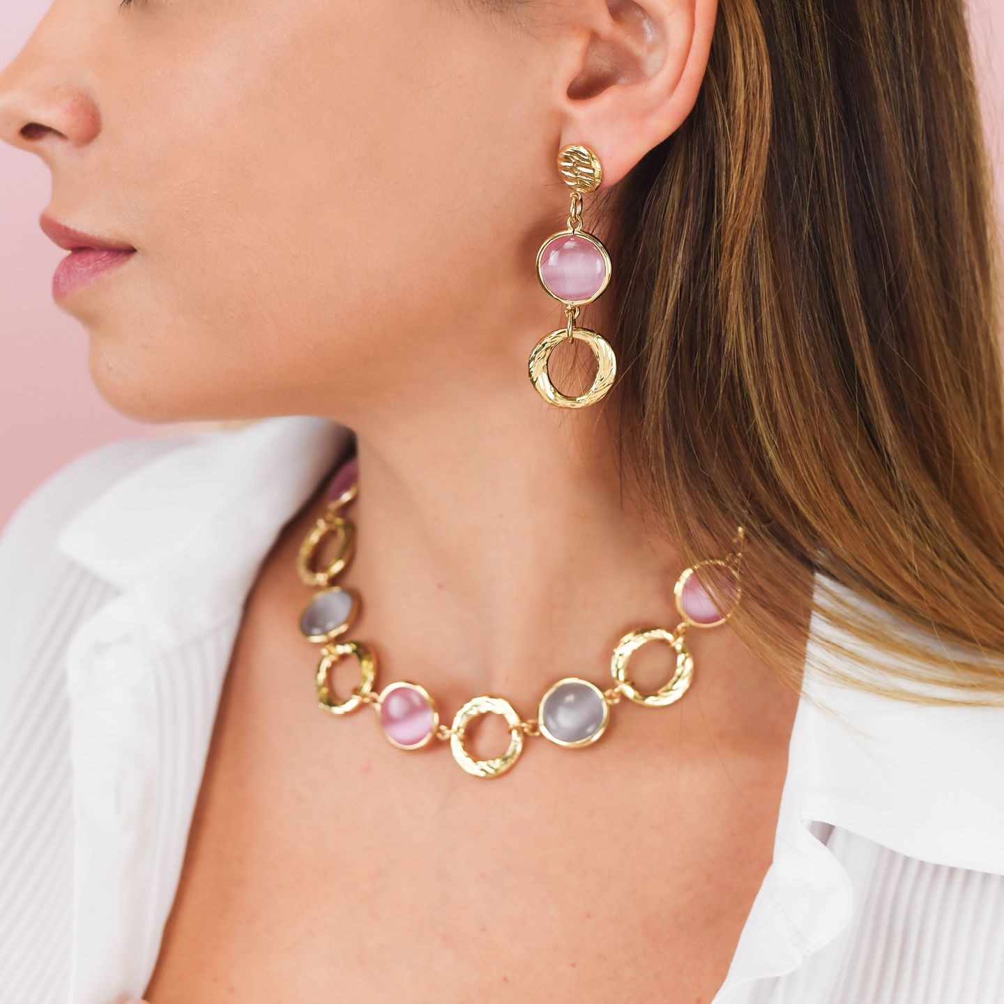 Collana donna boccadamo, XGR737DR, collezione crisette, in bronzo placcata oro giallo con cristalli effetto cabochon di colore rosa chiaro e grigio, tra moduli martellati Misure: lunghezza cm 42, 5, estendibile fino a cm 48 Dimensione: cristalli cm 1, 5