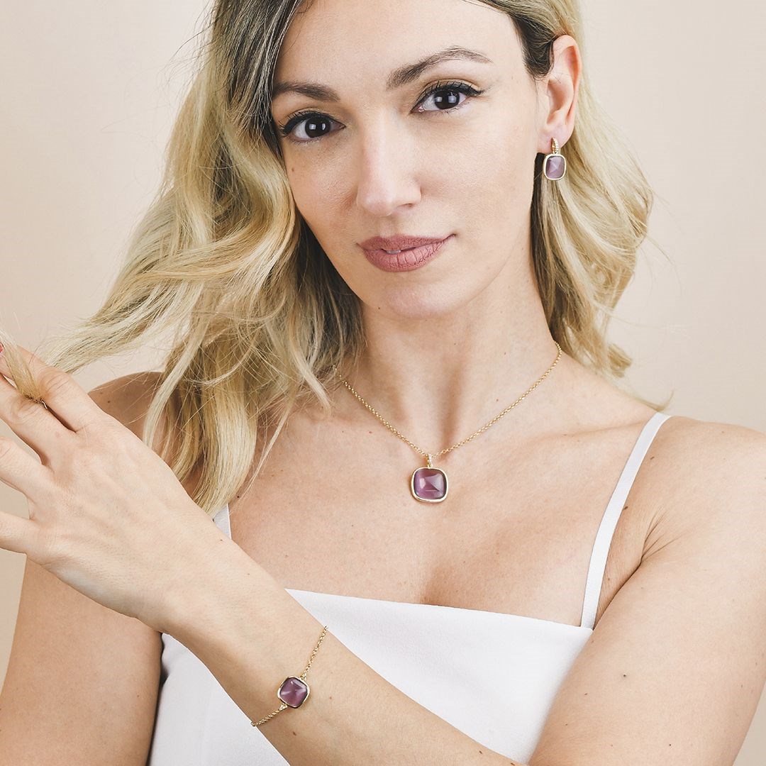 Collana donna boccadamo, XGR715DP, collezione crisette, in bronzo placcato oro giallo con pendente di cristallo color purple e contromaglia di zirconi Misure: lunghezza cm 39, estendibile fino a cm 44, 5 Dimensione: lunghezza pendente cm 2, cristallo cm 1, 3