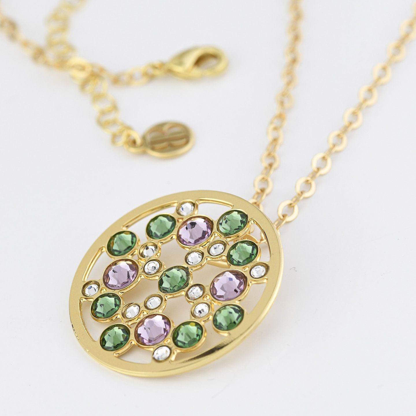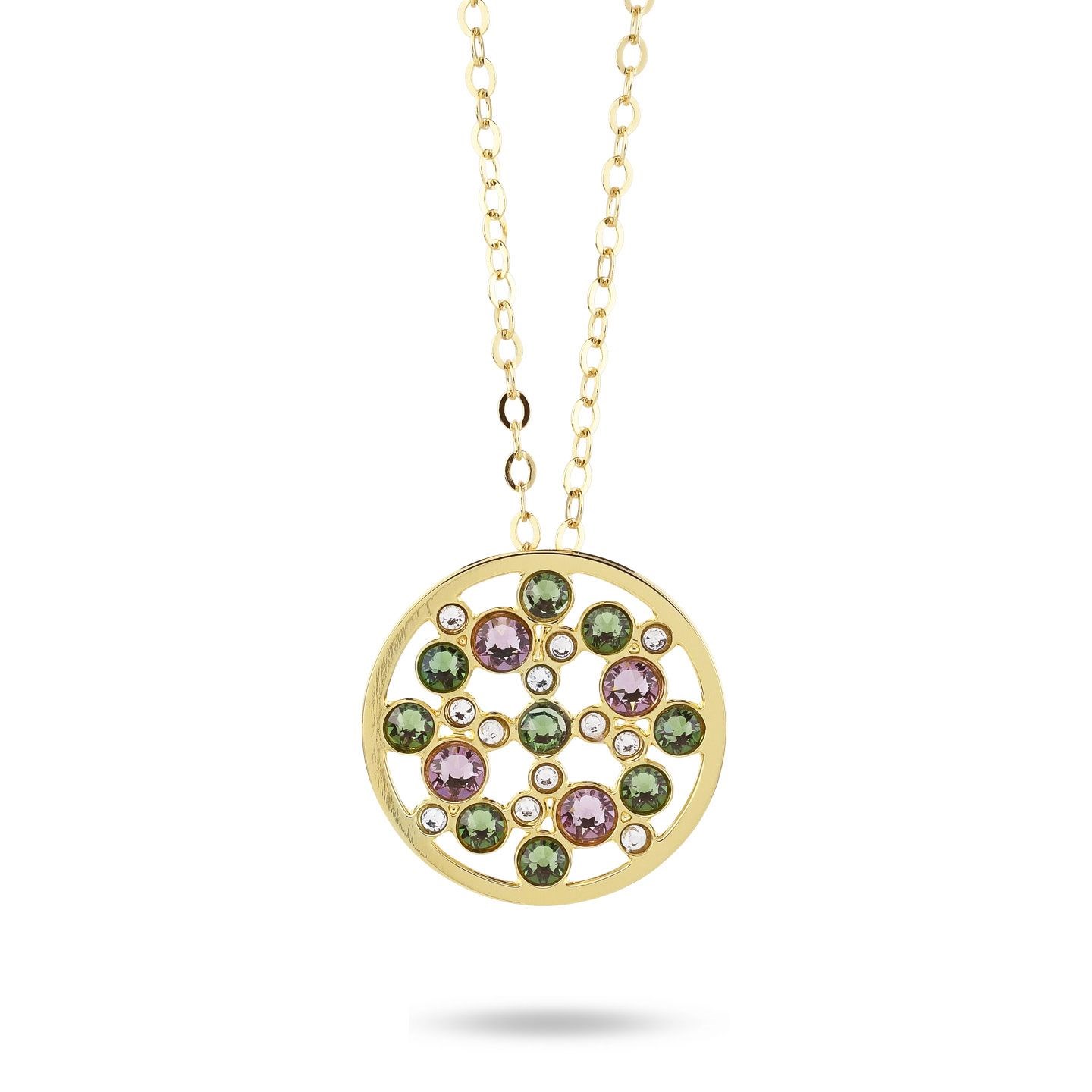 Collana donna boccadamo, XGR720D, collezione harem, in bronzo con placcatura dorata, pendente a cerchio con cristalli colorati. Misure: lunghezza cm 39 estendibile fino a cm 44, 5 Dimensione: diametro pendente cm 3, 2