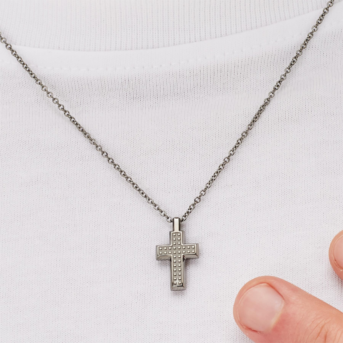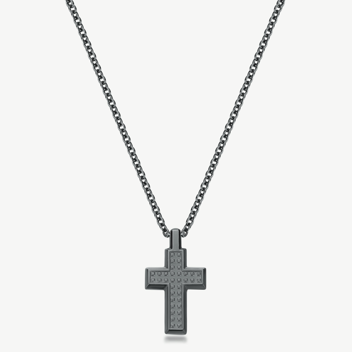 Collana uomo brosway, BUL56, collezione bullet, in acciaio 316L lucido e sabbiato, con finitura pvd colore rutenio e pendente a forma di croce. lunghezza 57cm.