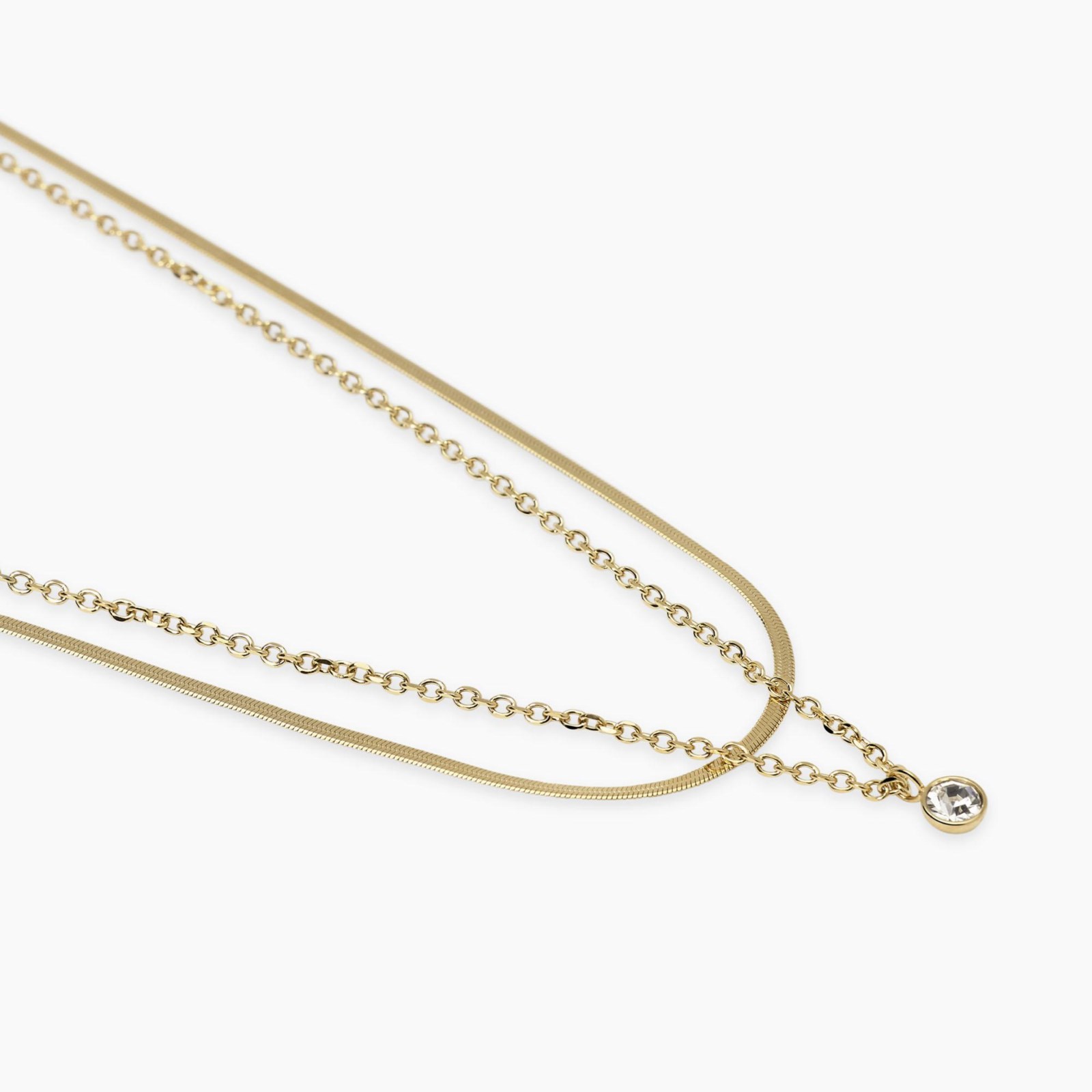 Collana donna kidult, 851046, collezione style, in acciaio dorato con catene forzatina diamantata e herringbone, e punto luce in cristallo. • Dimensione catena forzatina: 1, 8 mm • Dimensione catena herringbone: 1, 8 mm • Diametro cristallo: 4 mm • Misura regolabile, lunghezza da 38 a 43 cm