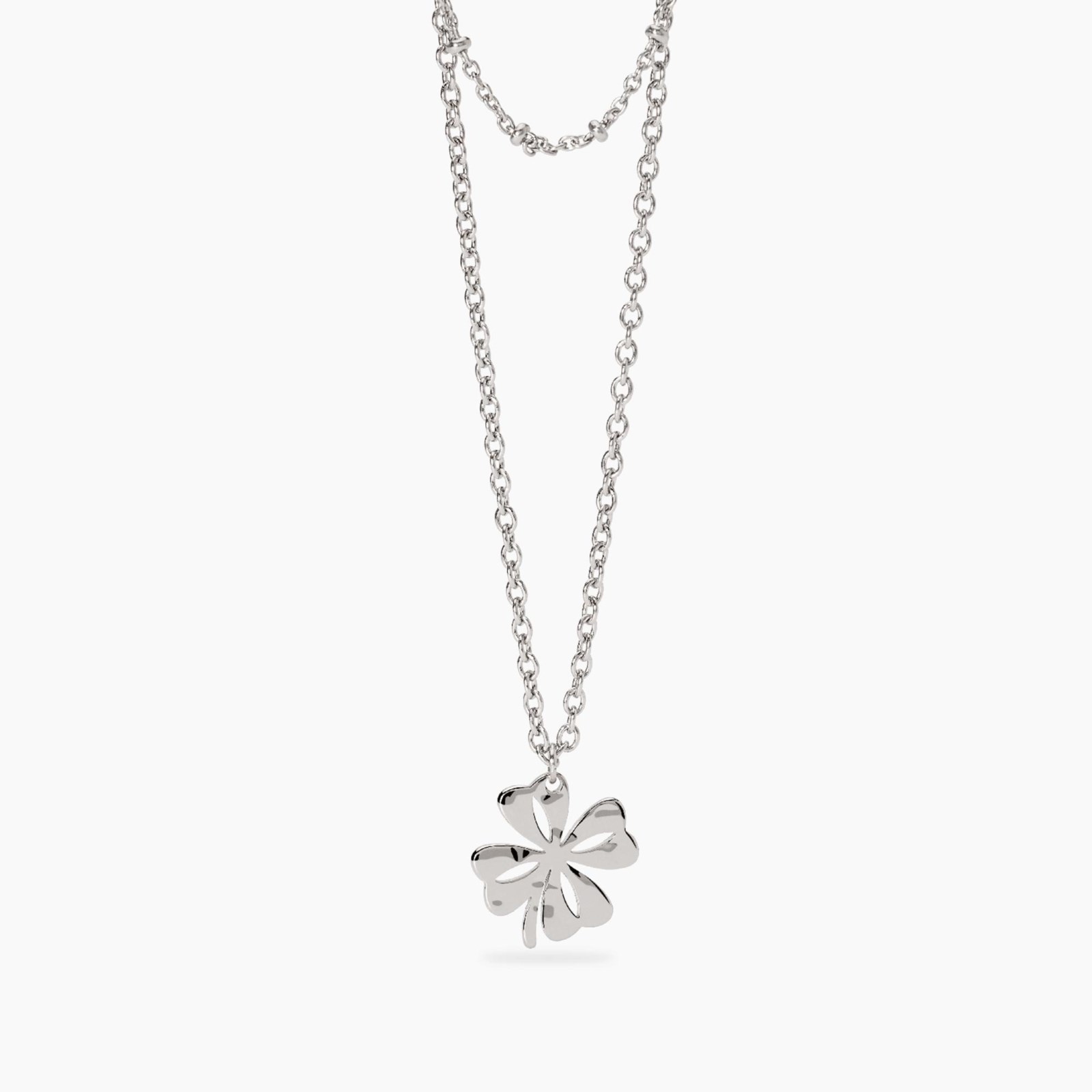 Collana donna kidult, 851093, collezione style, in acciaio con catene rolò e pendente quadrifoglio in acciaio martellato. • Dimensione catene: 1, 6 e 2 mm • Dimensione quadrifoglio: 15x15 mm • Misura regolabile, lunghezza da 45 a 50 cm