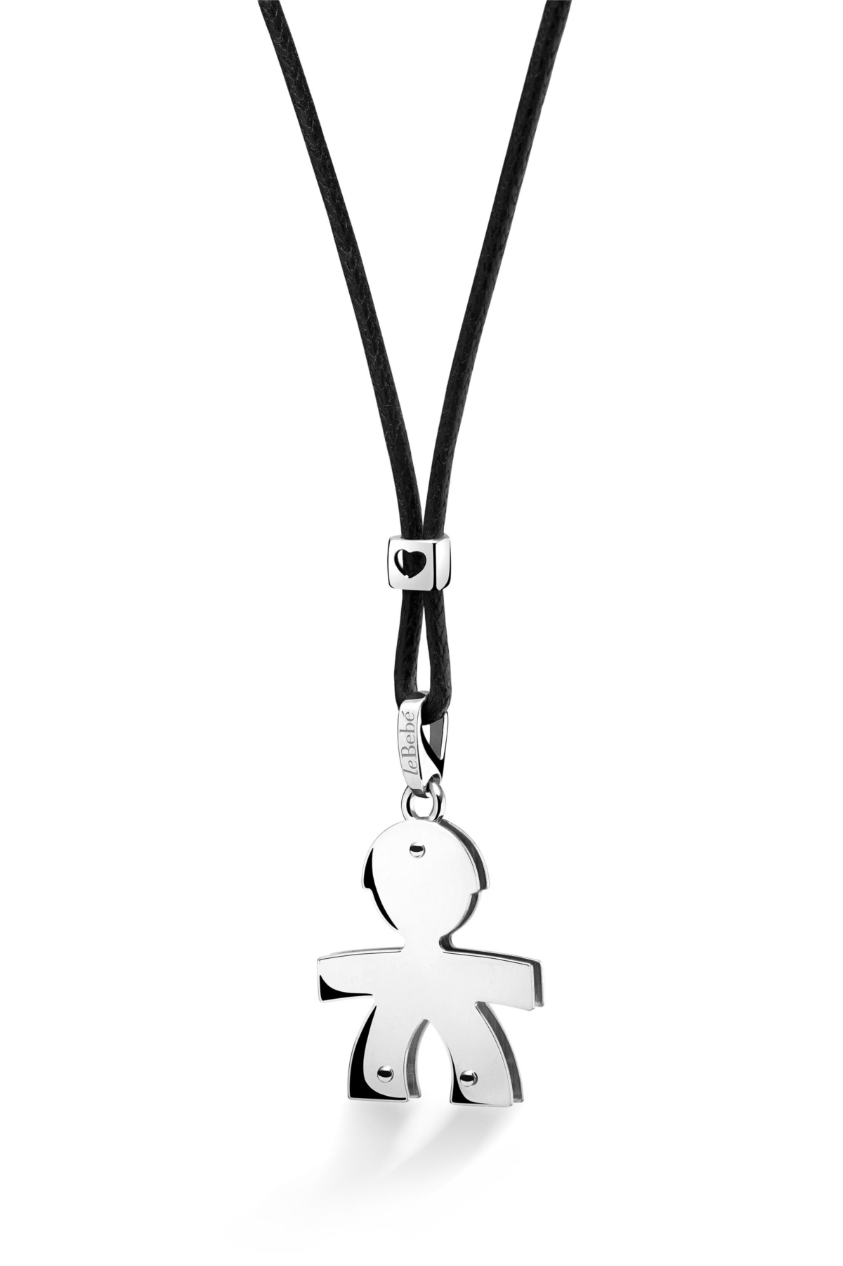 Collana donna le bebe, LBB002-N, collezione i classici, in oro bianco 9kt con sagoma bimbo su cordino ecologico nero, altezza 2cm, larghezza 1, 7cm