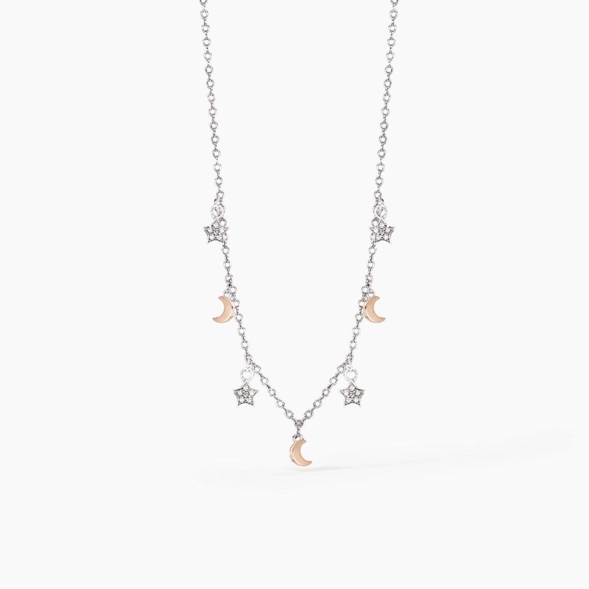 Collana donna mabina, 553265, collezione argento donna, in argento bicolore con ciondoli alternati a forma di luna e a forma di stella in pavé di zirconi. • Chiusura con moschettone • Misura unica, lunghezza 42 cm • Materiale: Argento 925, Argento 925 rosato, Zirconi
