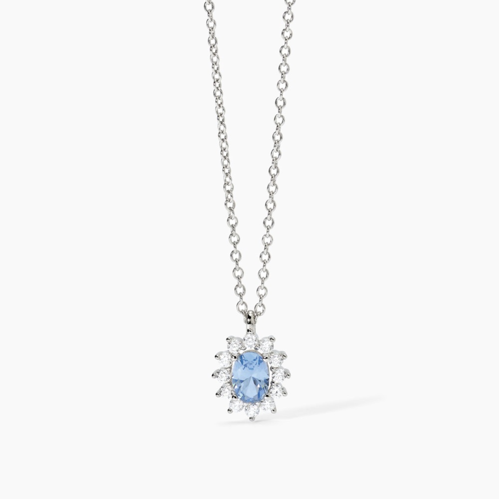 Collana donna mabina, 553644, collezione argento donna, in argento 925 rodiato con acquamarina sintetica e zirconi bianchi • Larghezza della catena forzatina: 1, 5 mm • Dimensione dell'acquamarina sintetica: 5 x 7 mm • Diametro degli zirconi bianchi: 2 mm • Lunghezza regolabile da 40 a 45 cm