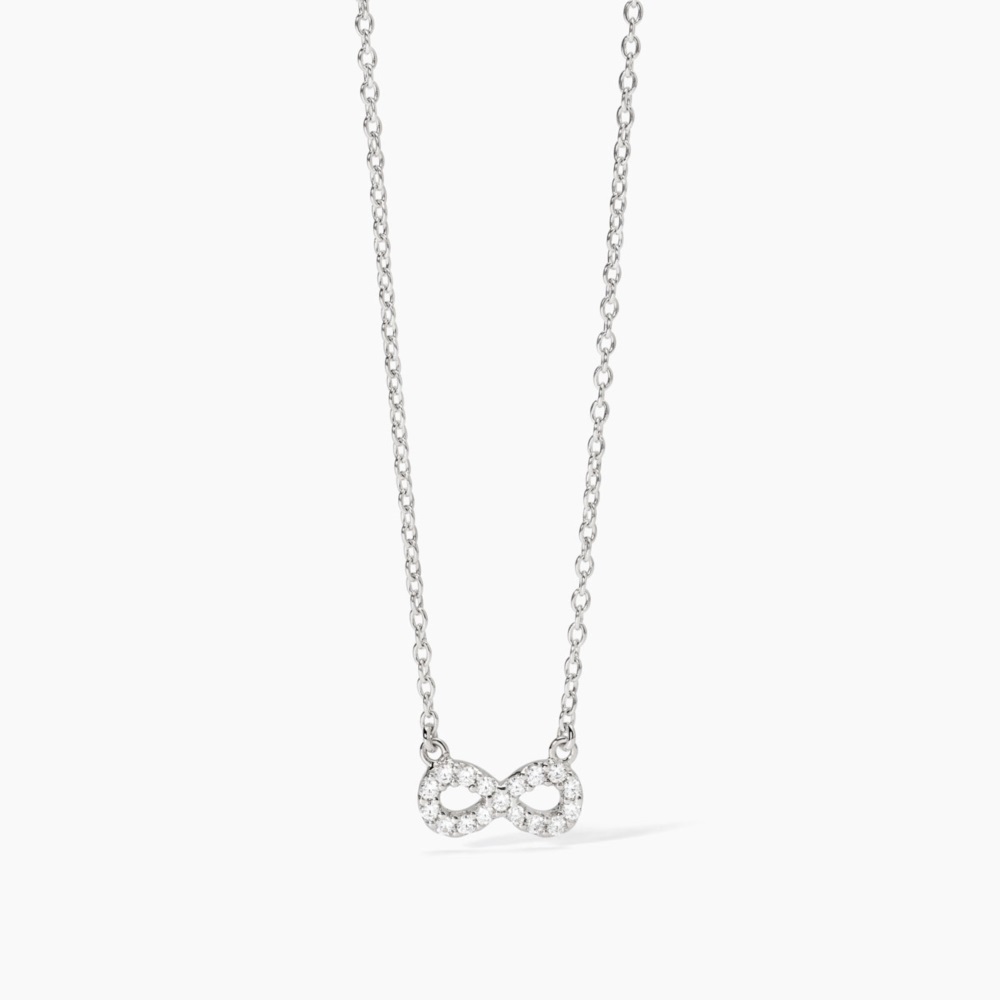 Collana donna mabina, 553654, collezione argento donna, in argento 925 rodiato con ciondolo infinito e zirconi bianchi • Larghezza della catena forzatina: 1, 5 mm • Dimensione del pendente: 10, 5 x 5 mm • Diametro degli zirconi bianchi: 1, 25 mm • Lunghezza regolabile da 40 a 45 cm