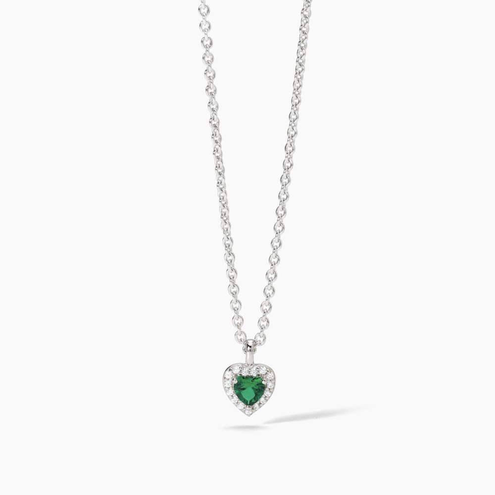 Collana donna mabina, 553667, collezione argento donna, in argento 925 rodiato con smeraldo sintetico e zirconi bianchi • Larghezza della catena forzatina: 1, 5 mm • Dimensione del pendente: 6 x 6 mm • Dimensione dello smeraldo sintetico taglio cuore: 4 x 4 mm • Diametro zirconi bianchi: 1 mm • Lunghezza regolabile da 39 a 43 cm