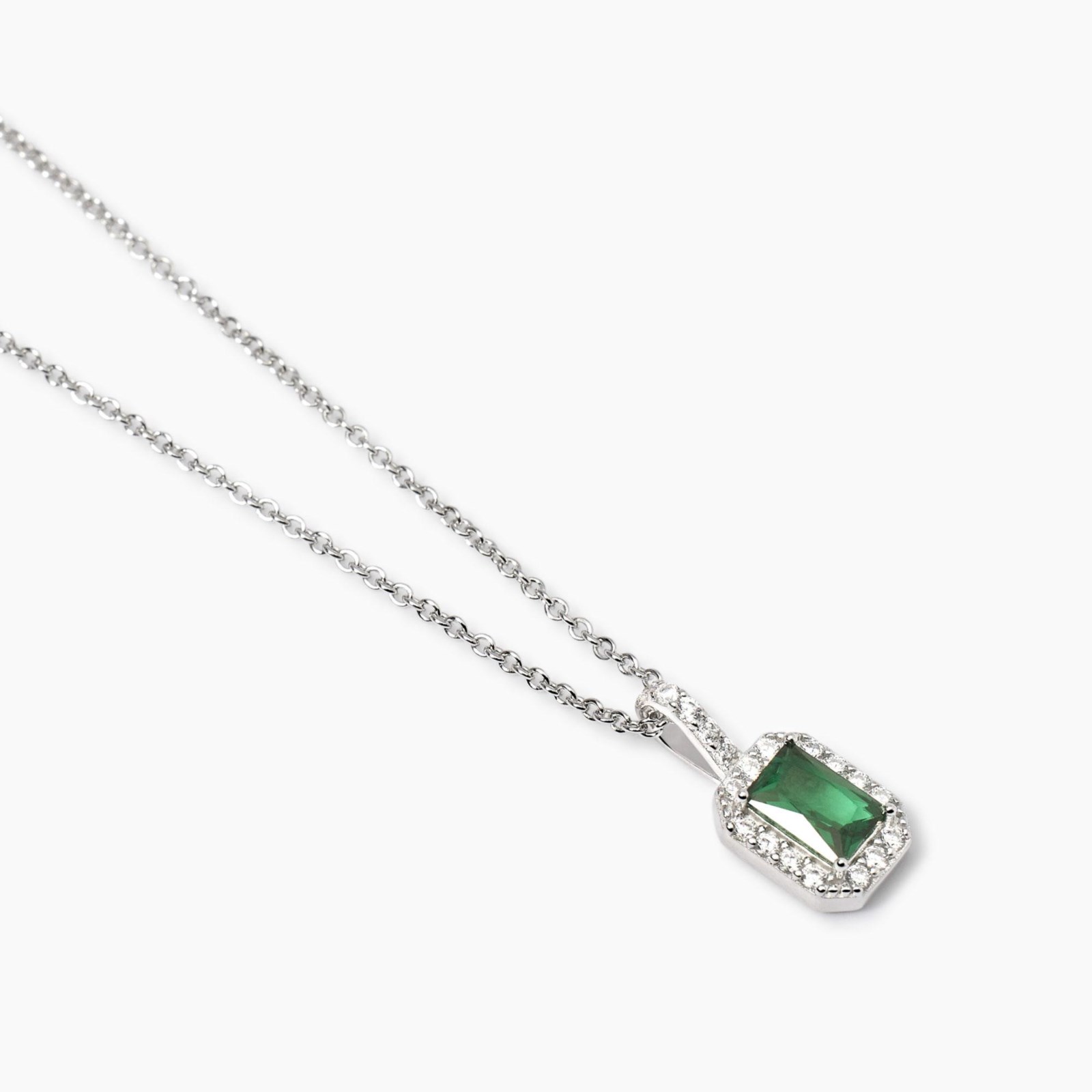 Collana donna mabina, 553787, collezione argento donna, in argento con catena rolò e ciondolo in zirconi e smeraldo sintetico taglio baguette. • Dimensione catena: 1, 2 mm • Dimensione pendente taglio baguette: 7x9 mm • Dimensione smeraldo sintetico: 4x6 mm • Diametro zirconi: 1, 25 mm • Misura regolabile dalla 39 alla 43 cm