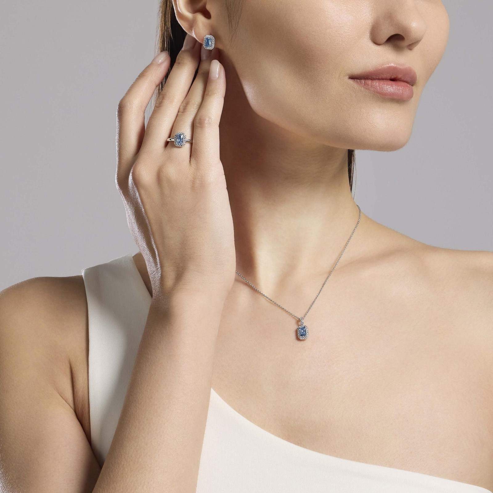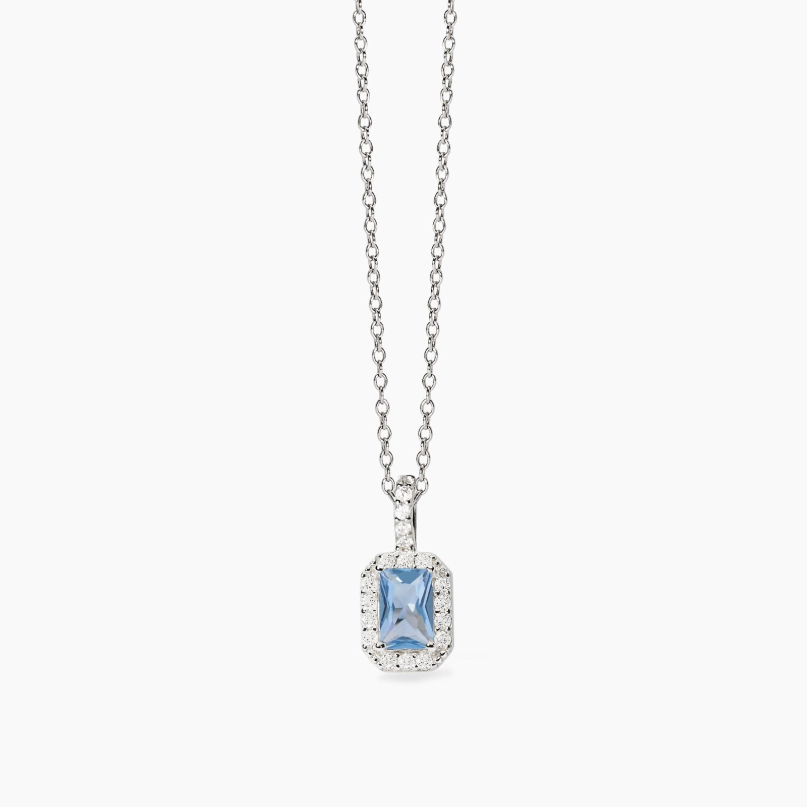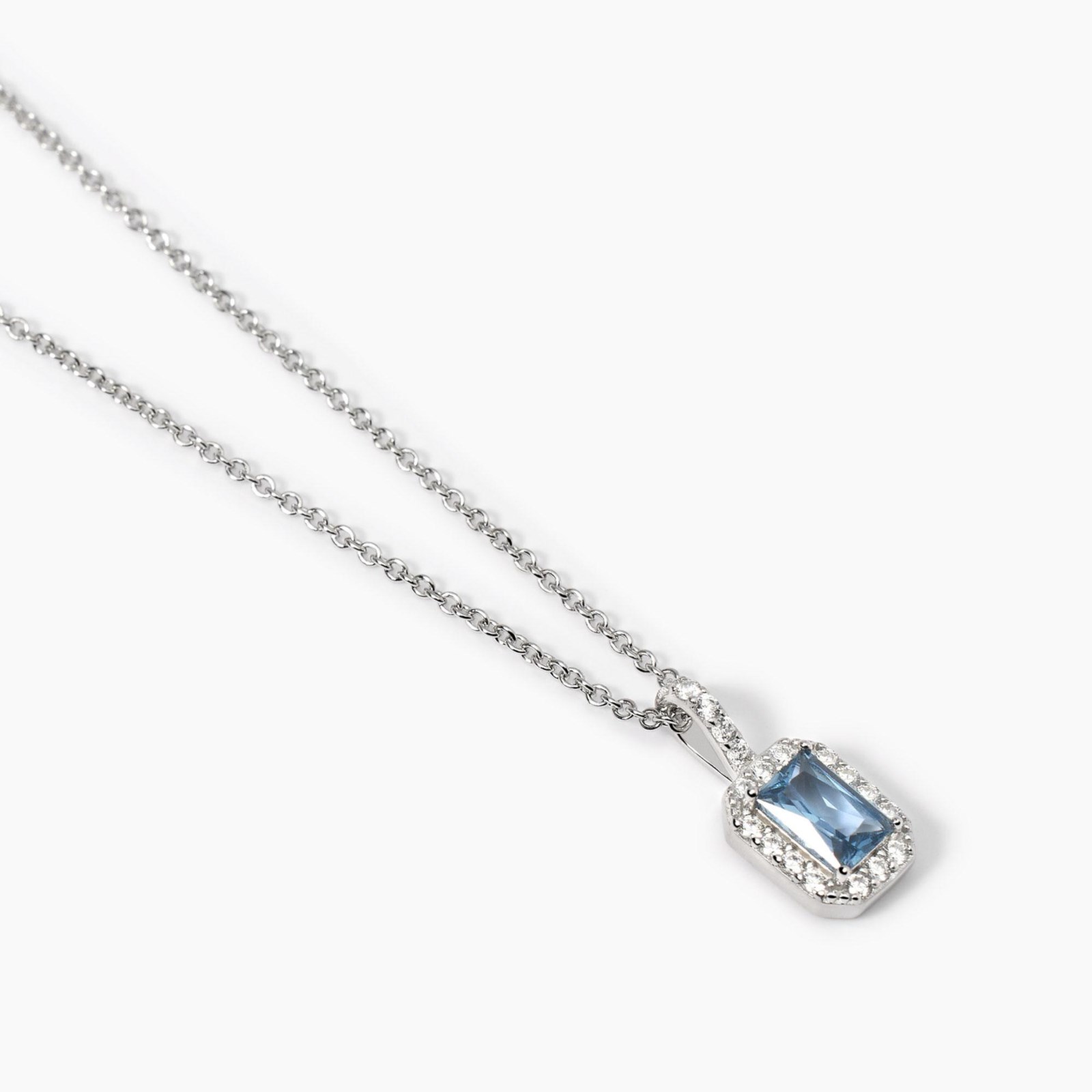 Collana donna mabina, 553788, collezione argento donna, in argento con catena rolò e ciondolo in zirconi e acquamarina sintetica taglio baguette. • Dimensione catena: 1, 2 mm • Dimensione pendente taglio baguette: 7x9 mm • Dimensione acquamarina sintetica: 4x6 mm • Diametro zirconi: 1, 25 mm • Misura regolabile dalla 39 alla 43 cm