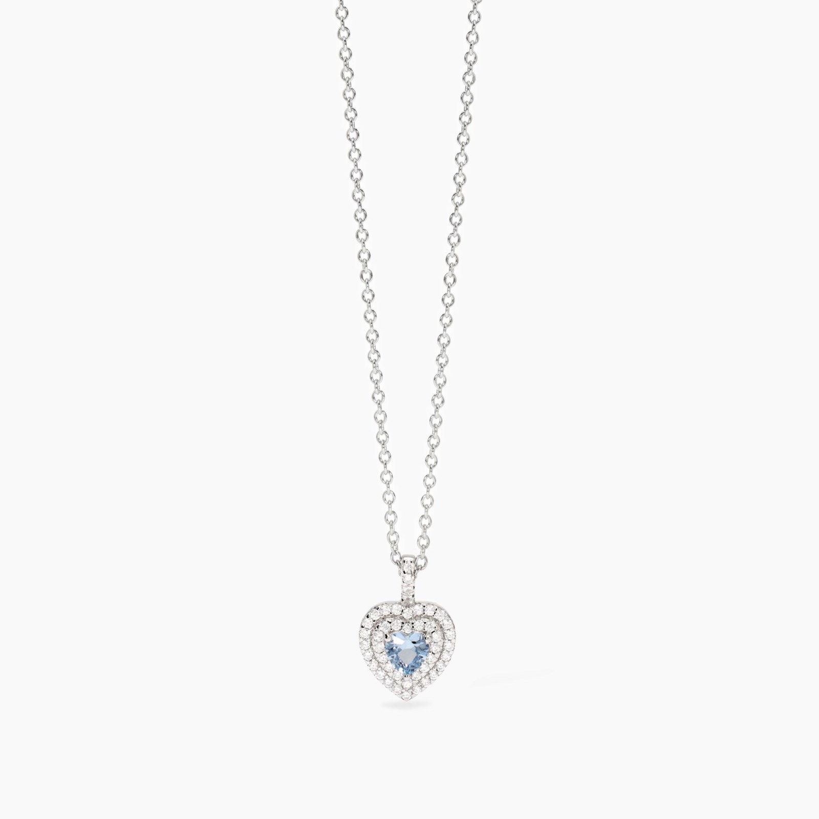 Collana donna mabina, 553824, collezione argento donna, in argento rodiato con catena rolò e acquamarina sintetica taglio cuore con zirconi. • Dimensione pendente cuore: 10, 8x11, 2 mm • Dimensione acquamarina sintetica: 5x5 mm • Diametro zirconi: 1, 25 mm • Misura regolabile da 39 a 43 cm