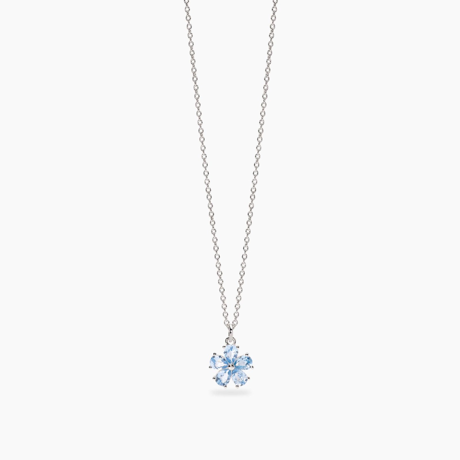 Collana donna mabina, 553857, collezione argento donna, in argento rodiato con catena rolò e pendente fiore con acquamarine sintetiche taglio goccia. • Dimensione catena rolò: 1, 2 mm • Dimensione pendente: 8, 6x8, 4 mm • Dimensione zirconi taglio goccia: 2, 5x4 mm • Misura regolabile, lunghezza da 40 a 45 cm