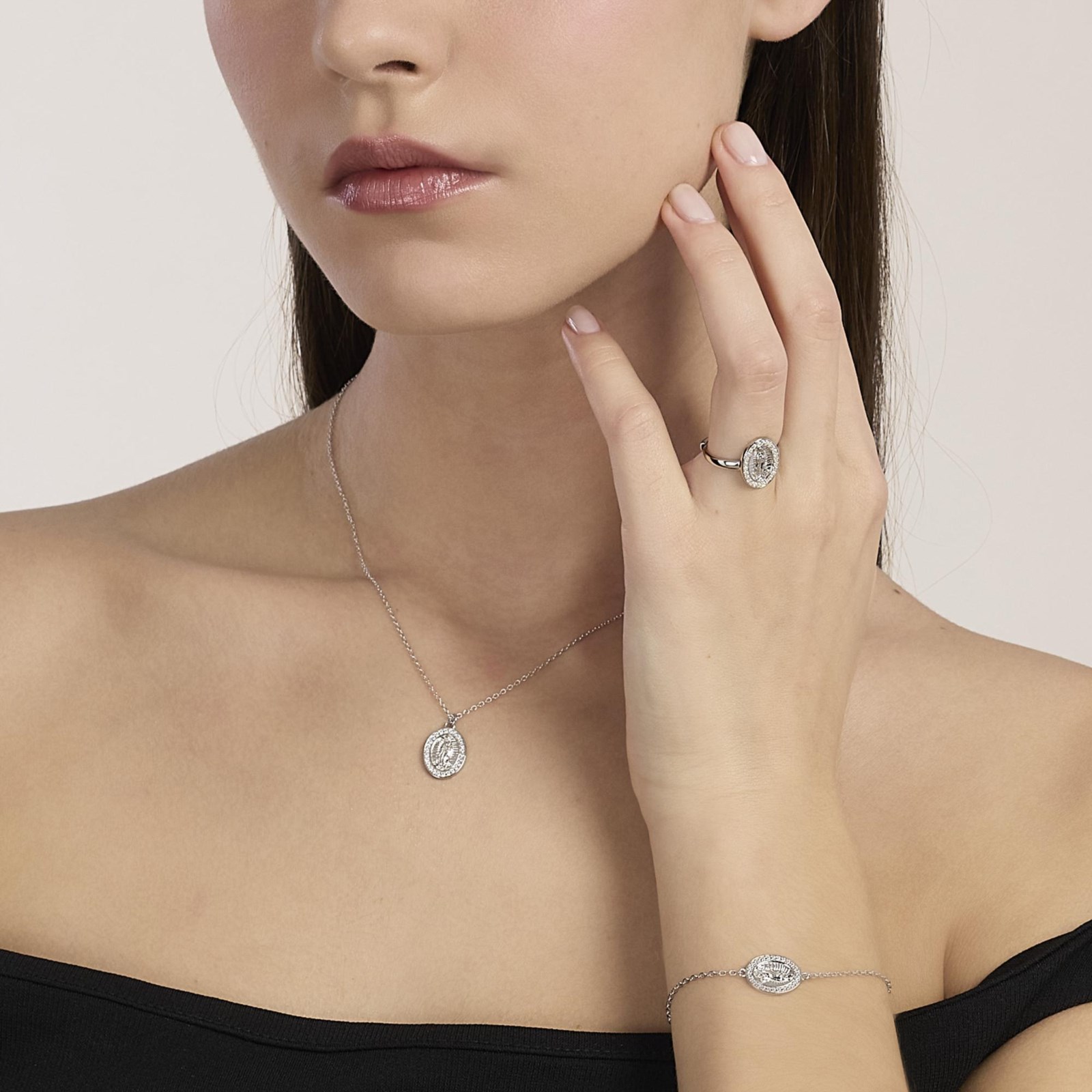Collana donna mabina, 553894, collezione argento donna, in argento rodiato con catena rolò e ciondolo ovale con Madonnina e zirconi bianchi.