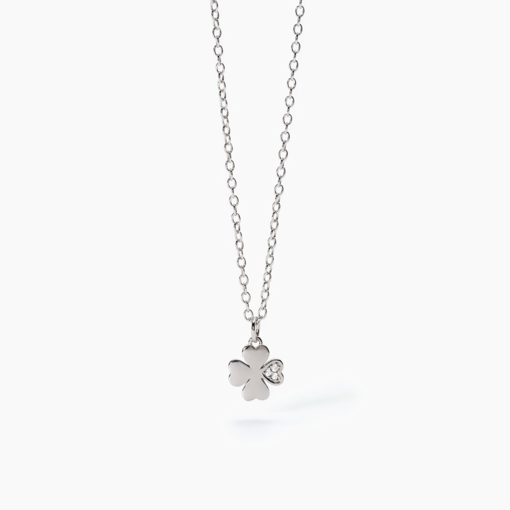 Collana bambina mabina, 553624, collezione argento junior, in argento 925 rodiato con ciondolo quadrifoglio e zirconi • Larghezza della catena: 1, 5 mm • Dimensioni ciondolo: 8 x 8mm • Diametro zirconi: 1 mm • Misura regolabile, lunghezza da 38 a 41 cm • Chiusura con moschettone