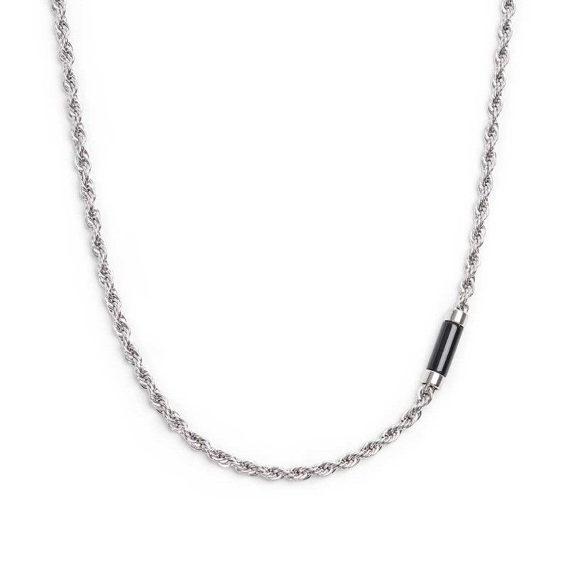 Collana uomo marlù, 30CN0009-N, collezione icons, in acciaio con catena corda con elemento cilindrico in onice nero. Lunghezza totale 50 cm, regolabile da 50 a 48 cm tramite logo tag Marlù in acciaio removibile.