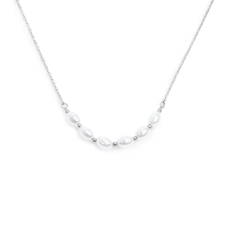 Collana donna marlù, 33CN0030-W, collezione vision, in acciaio con catena cross, al centro perle ovali bianche rivestite alternate ad elementi di acciaio.