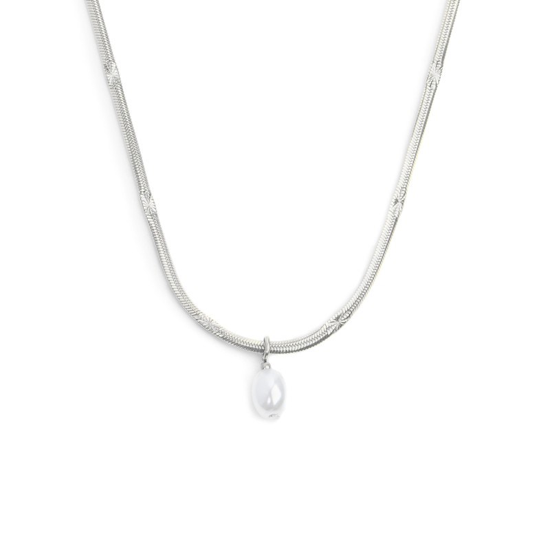 Collana donna marlù, 33CN0034-W, collezione vision, in acciaio con catena snake piatta con decoro, al centro un pendente con perla ovale bianca rivestita.