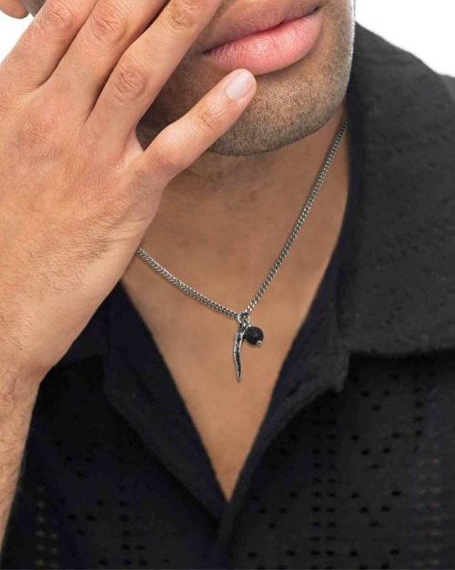 Collana uomo marlù, 33CO0022-N, collezione vision, in acciaio con catena a grumetta, con corno in acciaio con trama con black oil e sfera in pietra lavica pendenti.