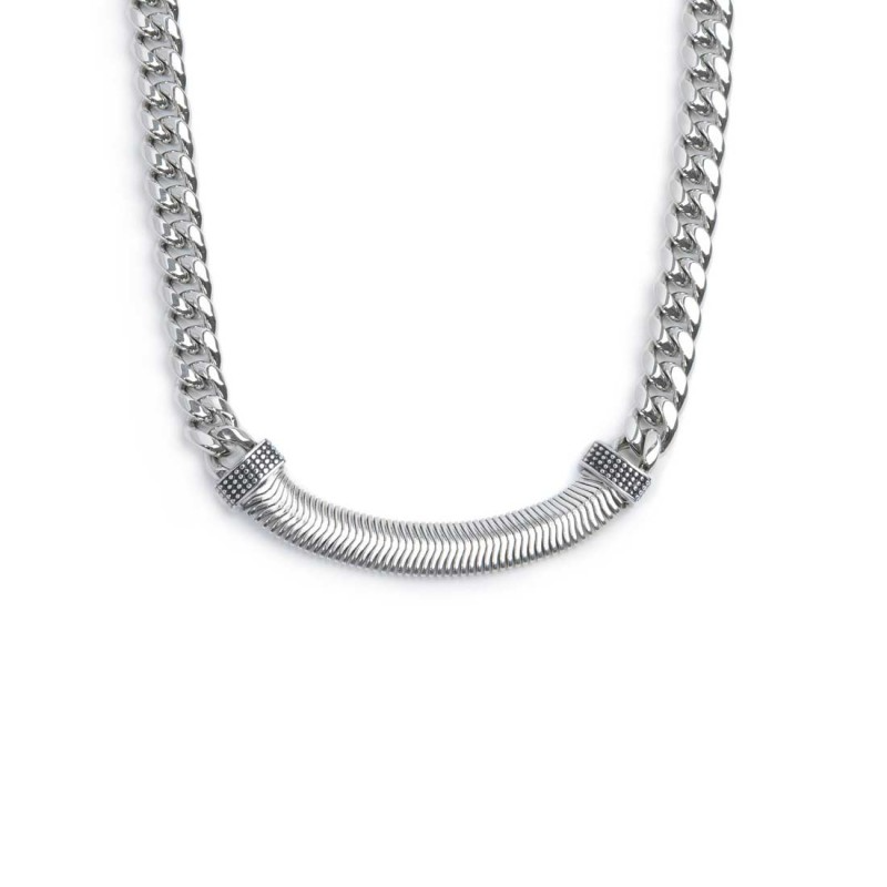 Nella parte centrale catena snake piatta con all'estremità elementi con trama puntinata in black oil.