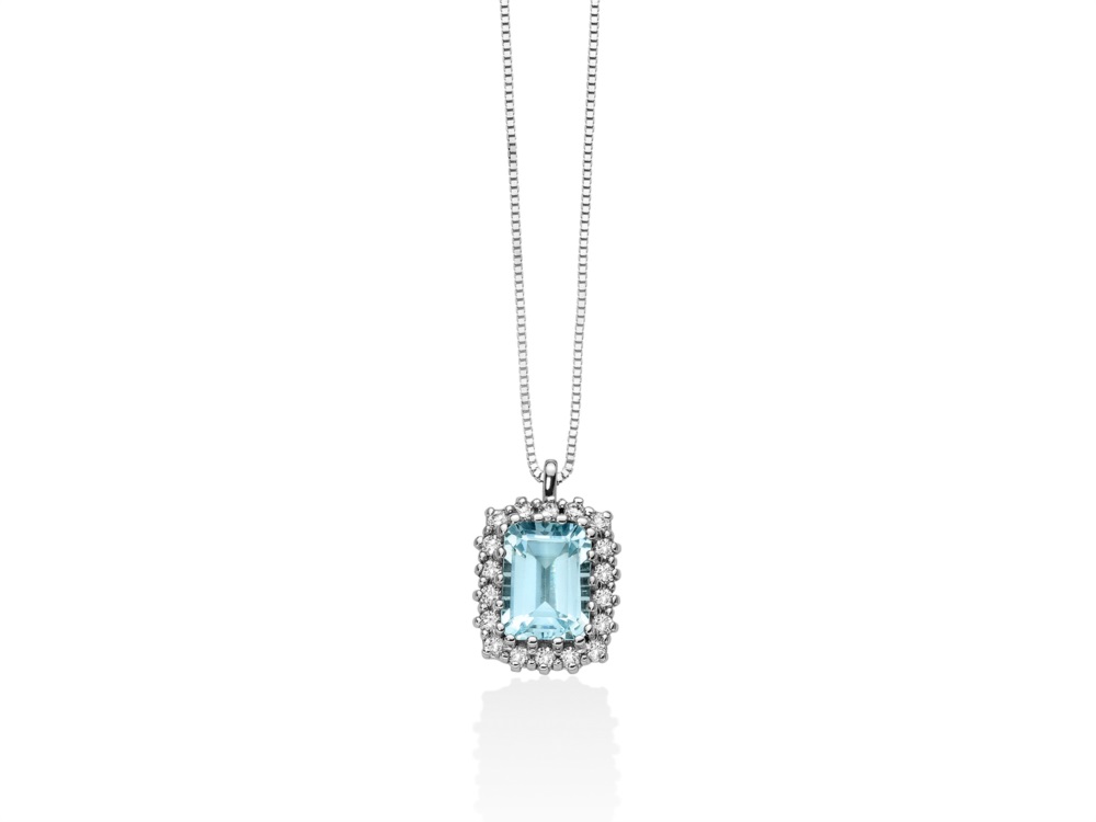 Collana donna miluna, Cld3927, collezione acquamarina. Oro 750/1000 Nr 18 Diamanti naturali Pt.tot 16, 2 Col.G Pur.SI Taglio Brillante Rotondo Nr 1 Acquamarina Ottagonale mm 7x5 Ct 0, 9 Catenina veneziana bianca Microfusione Griffes