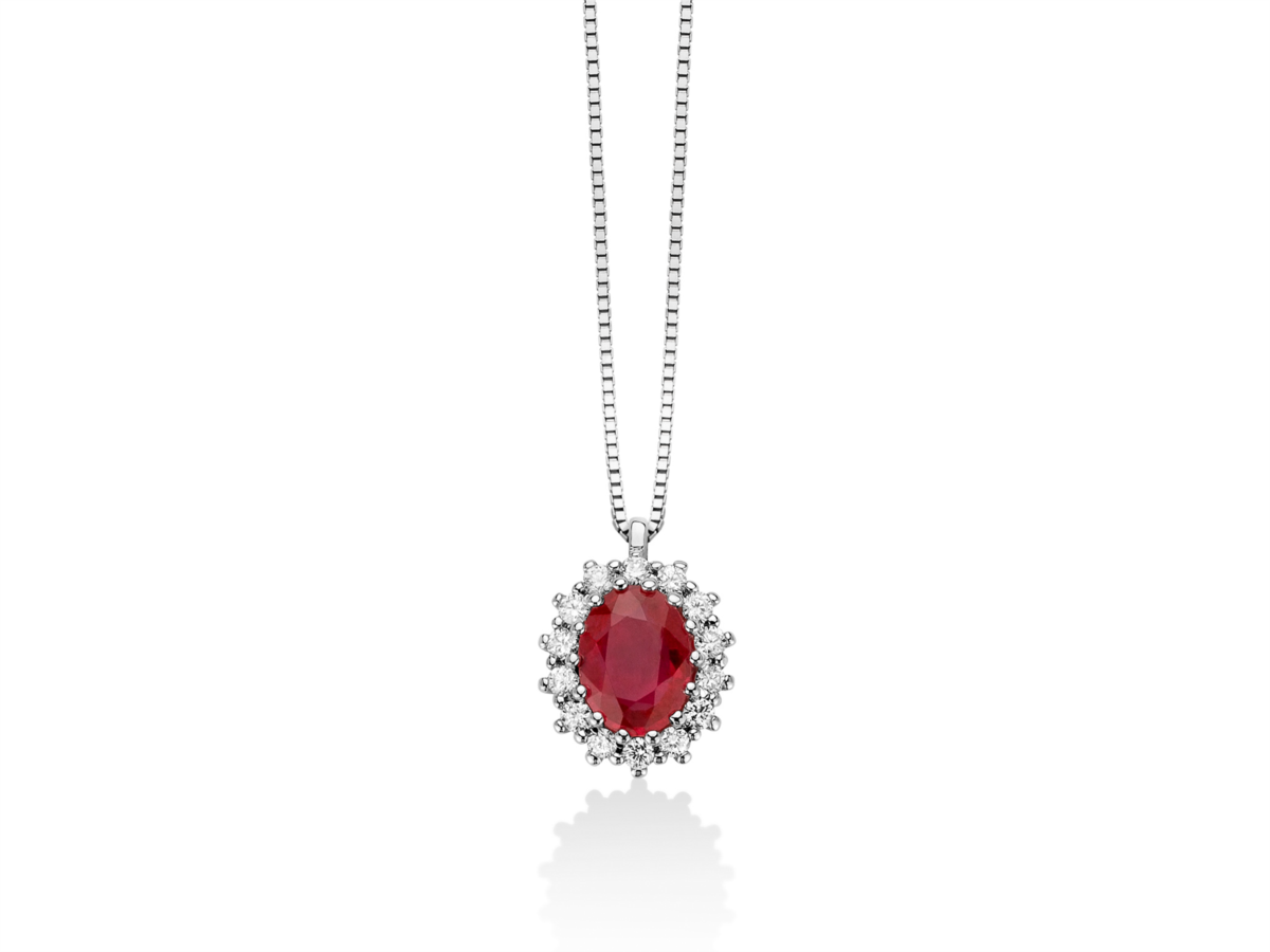 Collana donna miluna, CLD4250, collezione premium gemme Oro 750/1000 Nr 14 Diamanti naturali Pt.tot 28 Col.G Pur.SI Taglio Brillante Rotondo Nr 1 Rubini naturali Ovale mm 8x6 Ct 1, 54