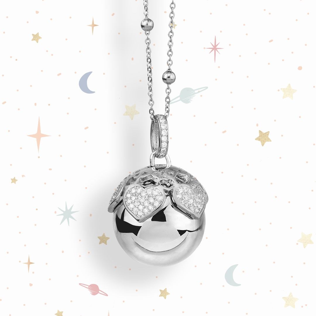 Collana donna mya, trgr37k, collezione angelomio, catena in acciaio, pendente in bronzo, ciondolo sonoro e coppetta con stelle di pavè di zirconi.