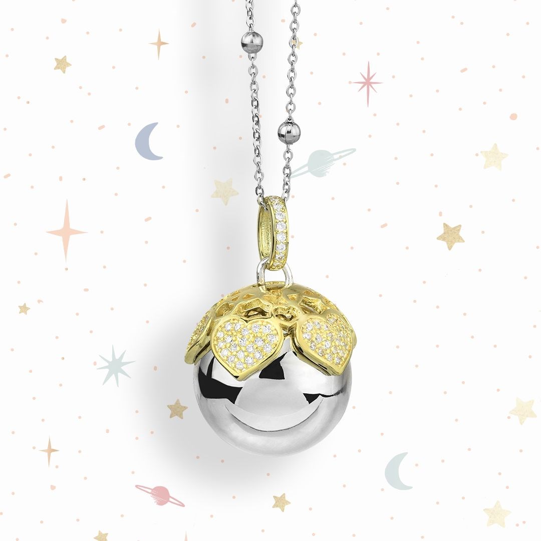 Collana donna mya, TRGR40K, collezione angelomio, catena in acciaio, pendente in bronzo, ciondolo sonoro e coppetta placcata oro giallo con cuori di pavè di zirconi.