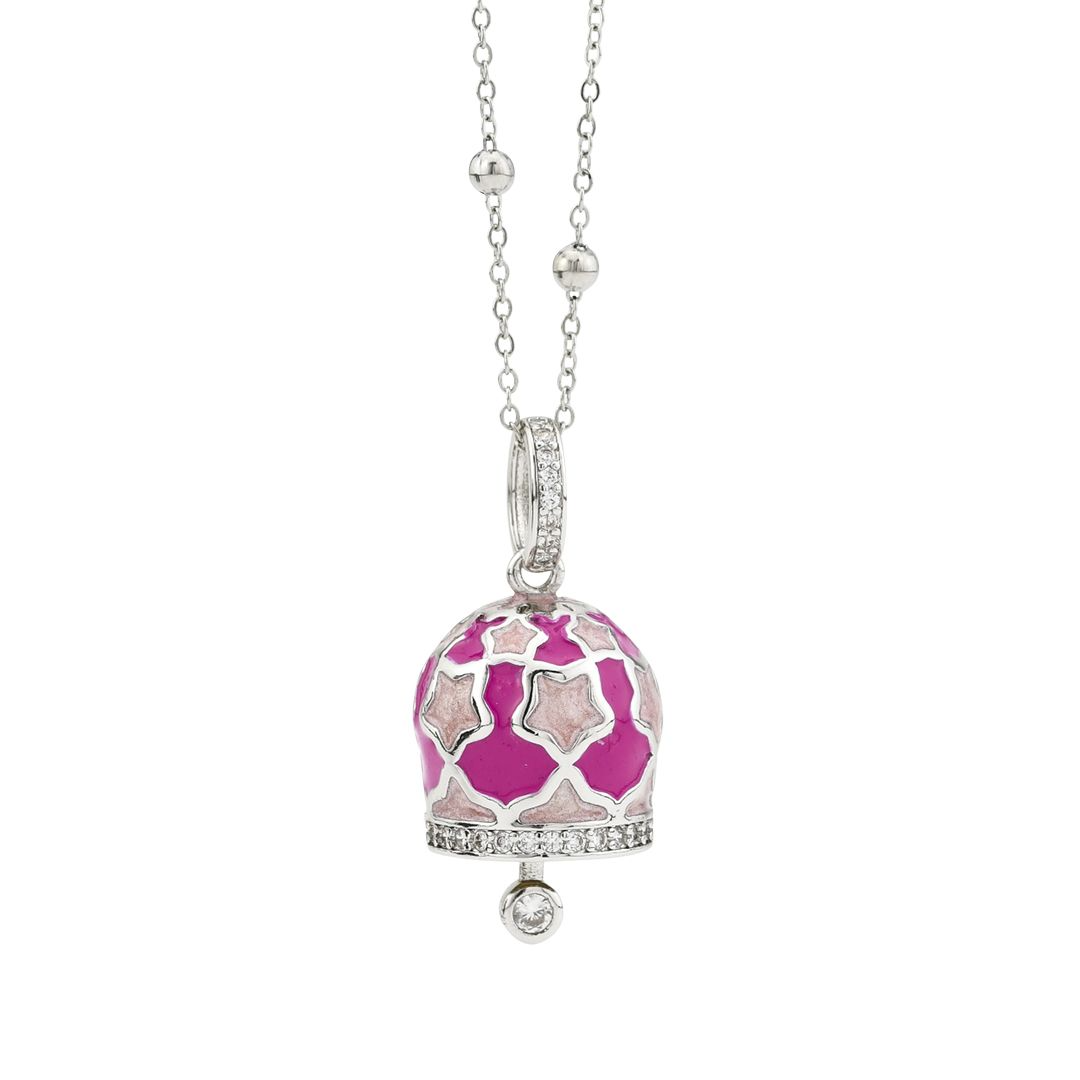 Collana donna mya, CLGR04, collezione campanelle, in acciaio rodiato con stelle rosa su base fucsia, impreziosita con zirconi.