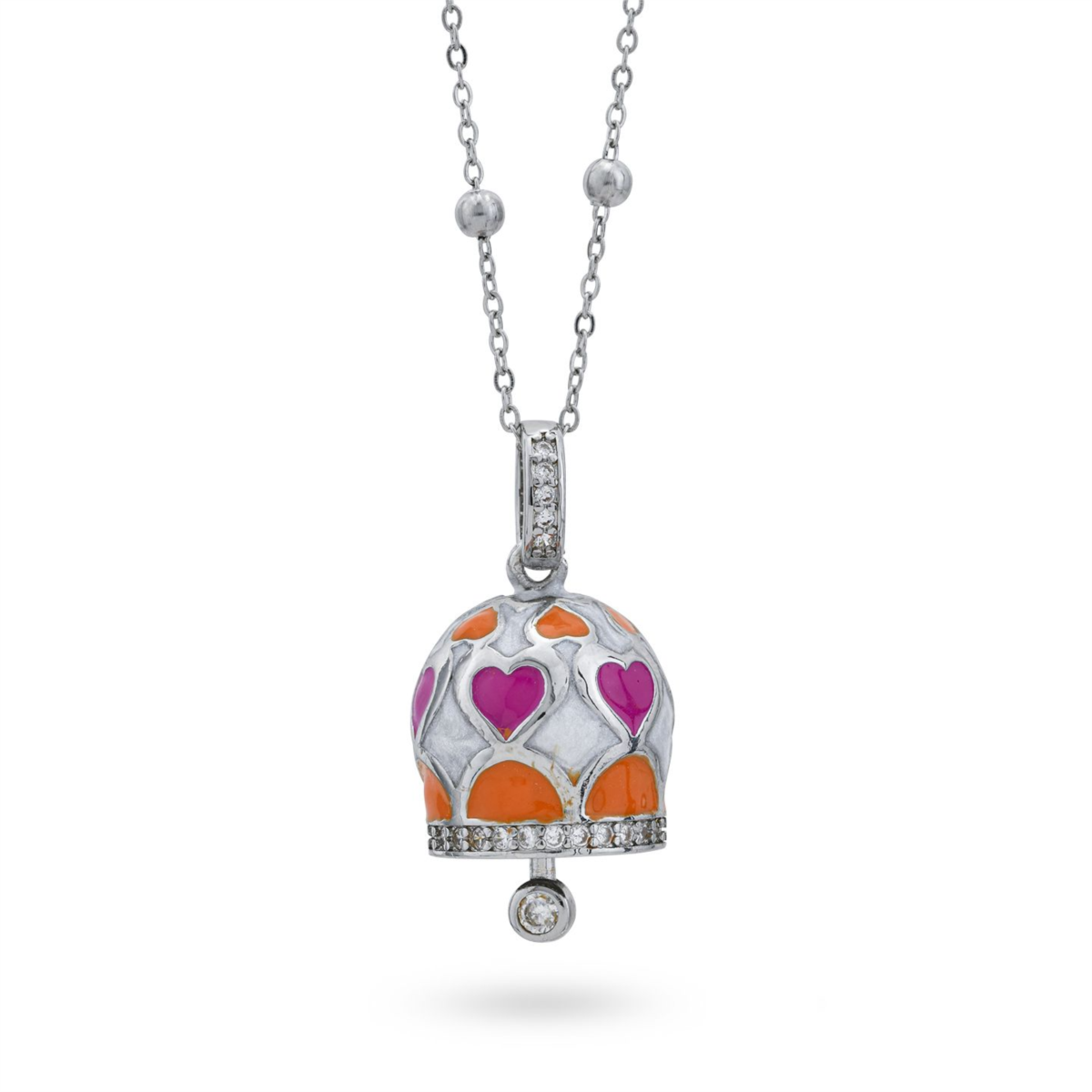 Collana donna mya, CLGR20, collezione campanelle, in acciaio ciondolo in bronzo con campanella rodiata con cuori fucsia e arancione su base bianco perlato, impreziosita da zirconi.
