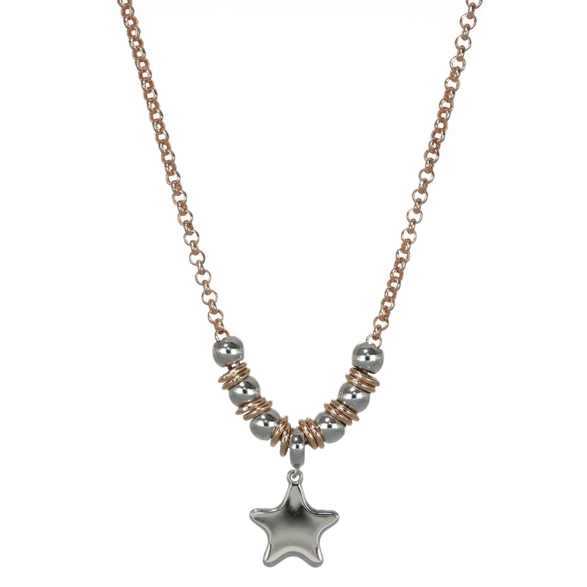 Collana donna mya, Sagr05, collezione sbarazzina, novità; in bronzo bicolor, sfere e passanti rodiati, oring placcati oro rosa e charms centrale rodiato a forma di stella.