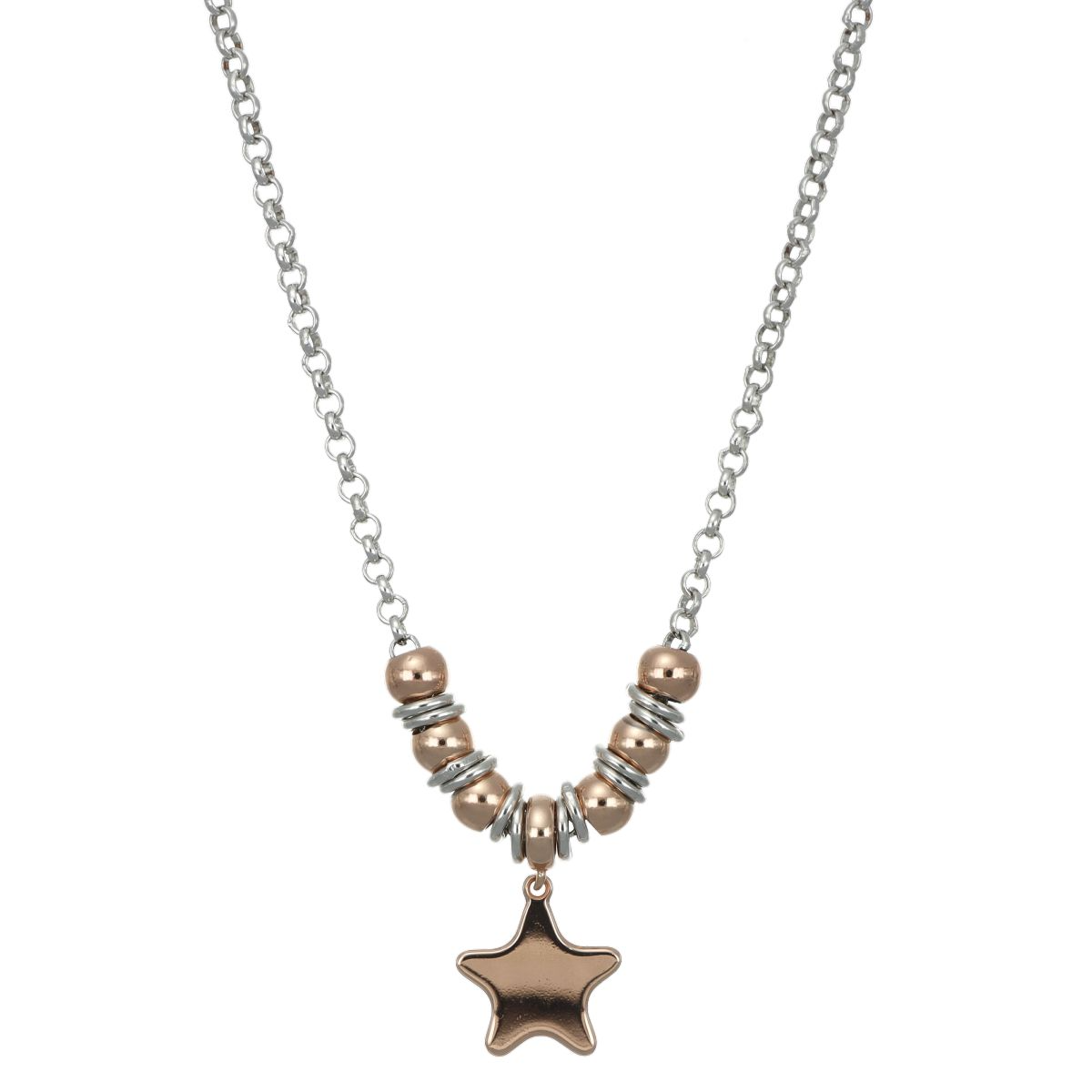Collana donna mya, Sagr02, collezione sbarazzina, novità; in bronzo bicolor, sfere e passanti placcati oro rosa, oring rodiati e charms centrale placcato oro rosa a forma di stella.