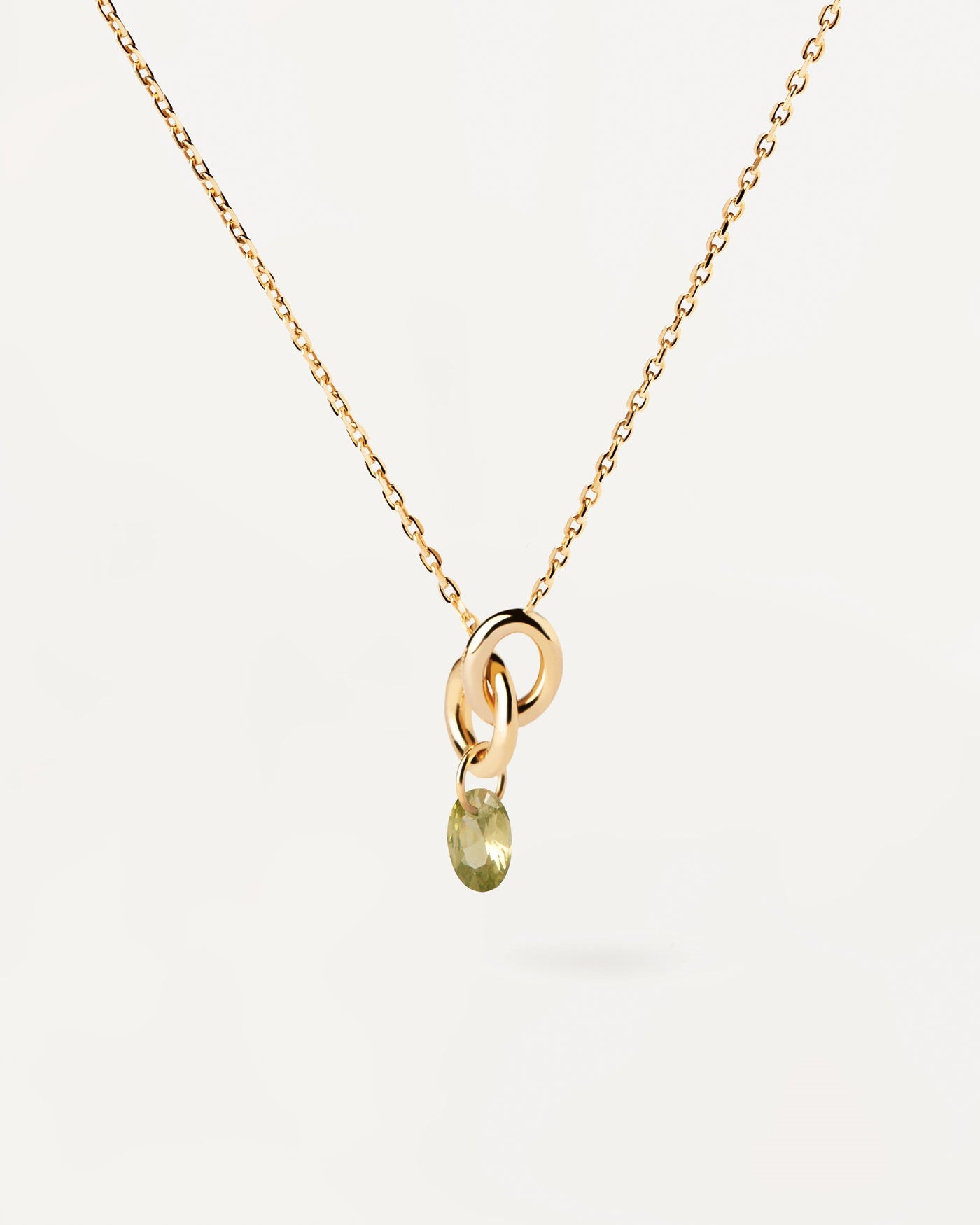 Collana donna pdpaola, CO01-845-U, collezione lily, in argento placcato oro 18kt con due anelli collegati tra loro e ciondolo con zirconi verde a goccia. Lunghezza della catena: Chiusura regolabile da 400 cm a 500 cm Dimensione della pietra: 6 mm