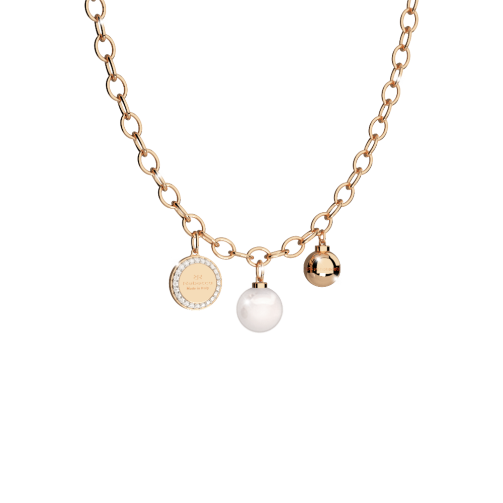 Collana donna rebecca, Bhokoo09, collezione hollywood , in bronzo placato oro rosa con perle e zirconi