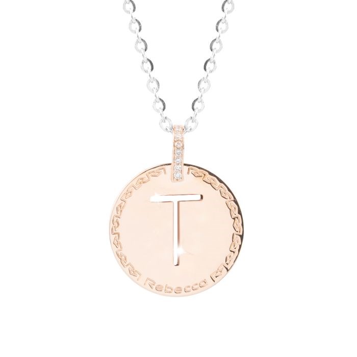 Collana donna rebecca, BWUKRT20, collezione myworld alphabet, in acciaio, ciondolo in bronzo placcato oro rosa con zirconi