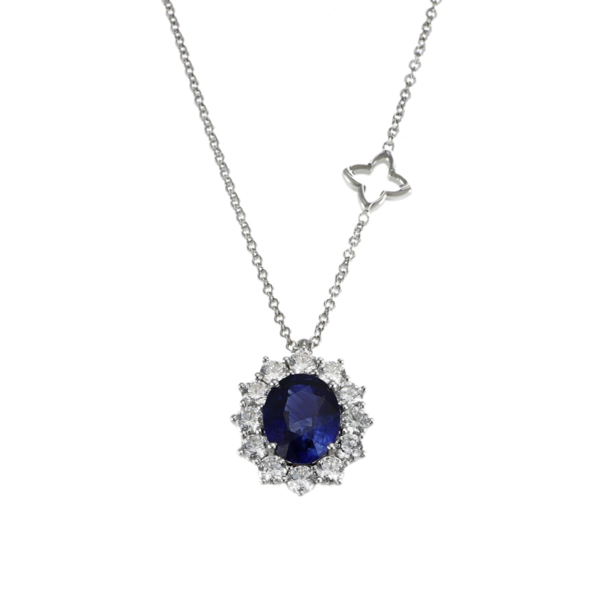 Collana donna recarlo, P79CC003/ZB070, collezione color special, in oro bianco 18kt, con 12 diamanti con caratura totale di 0, 55ct colore f, purezza vs, e zaffiro di 1, 43ct, lunghezza 45cm regolabile