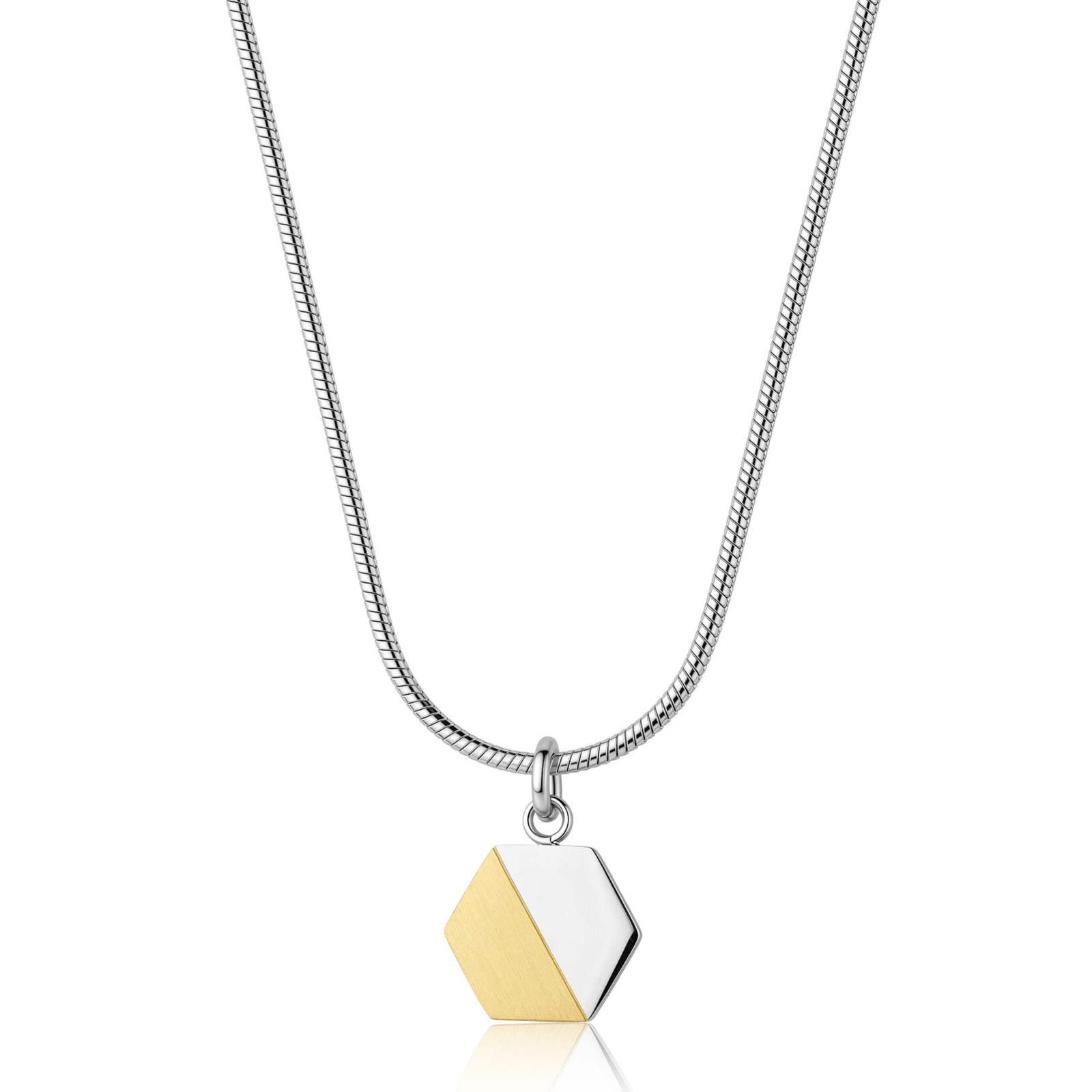 Collana uomo sagapò, SBD04, collezione bound, in acciaio 316L con pendente satinato a forma di esagono e finitura dorata.