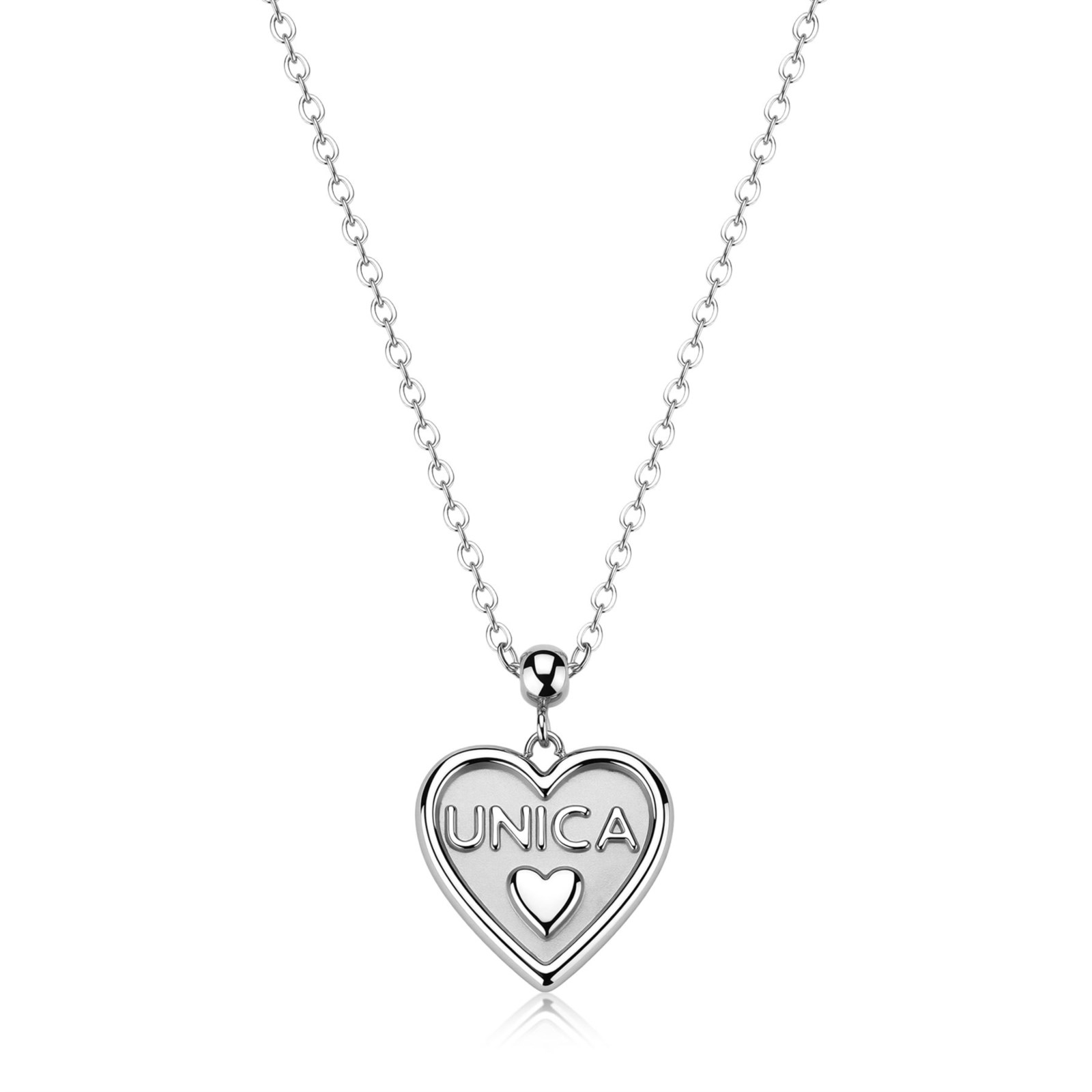 Collana donna sagapò, SUH05, collezione duh duh, girocollo in acciaio 316L con pendente a cuore satinato, scritta "Unica" e cuore.
