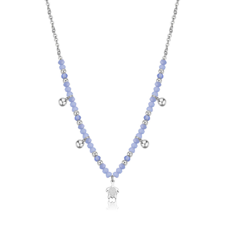 Collana donna s'agapo, SGI02, collezione glint, in acciaio 316L con sfere in vetro blu, pendenti a sfera e pendente centrale a forma di tartaruga, lunghezza 44cm