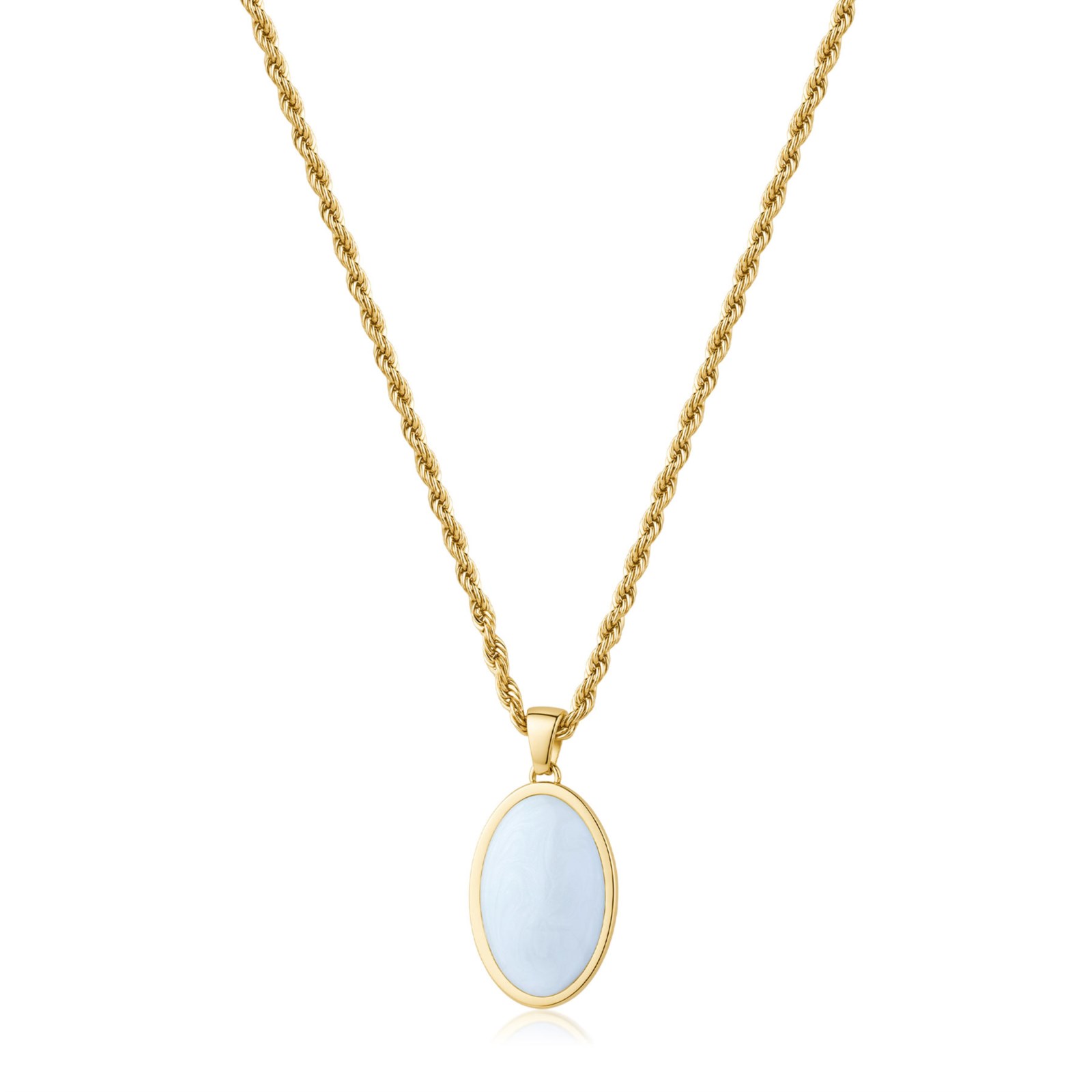 Collana donna sagapò, SDM02, collezione madame, in acciaio 316L e finitura dorata con pendente ovale e smalto bianco perla.