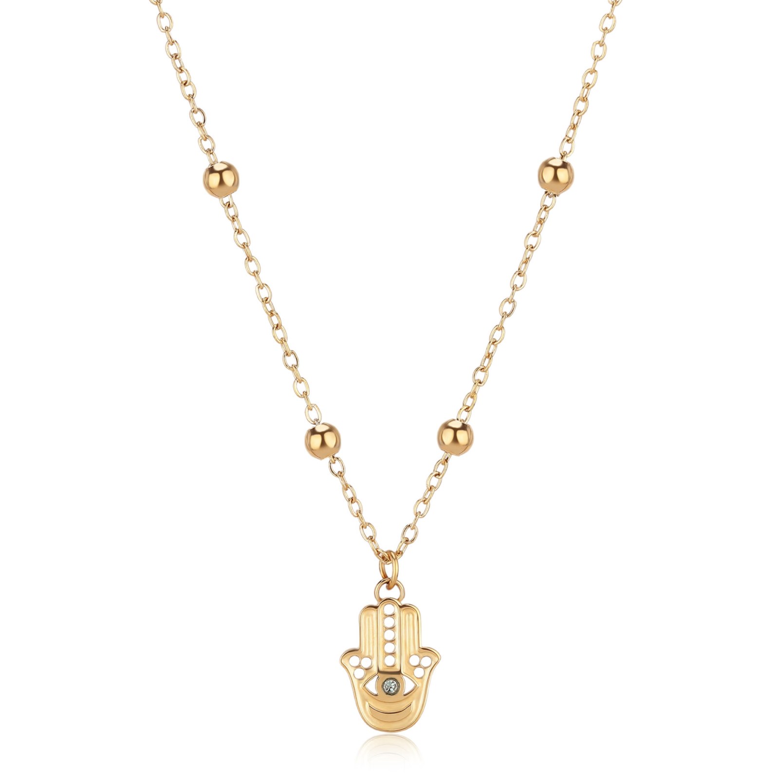 Collana donna sagapò, SWH08, collezione witch, in acciaio 316L e finitura pvd oro 14K con pendente mano di Fatima e cristallo. lunghezza 45cm