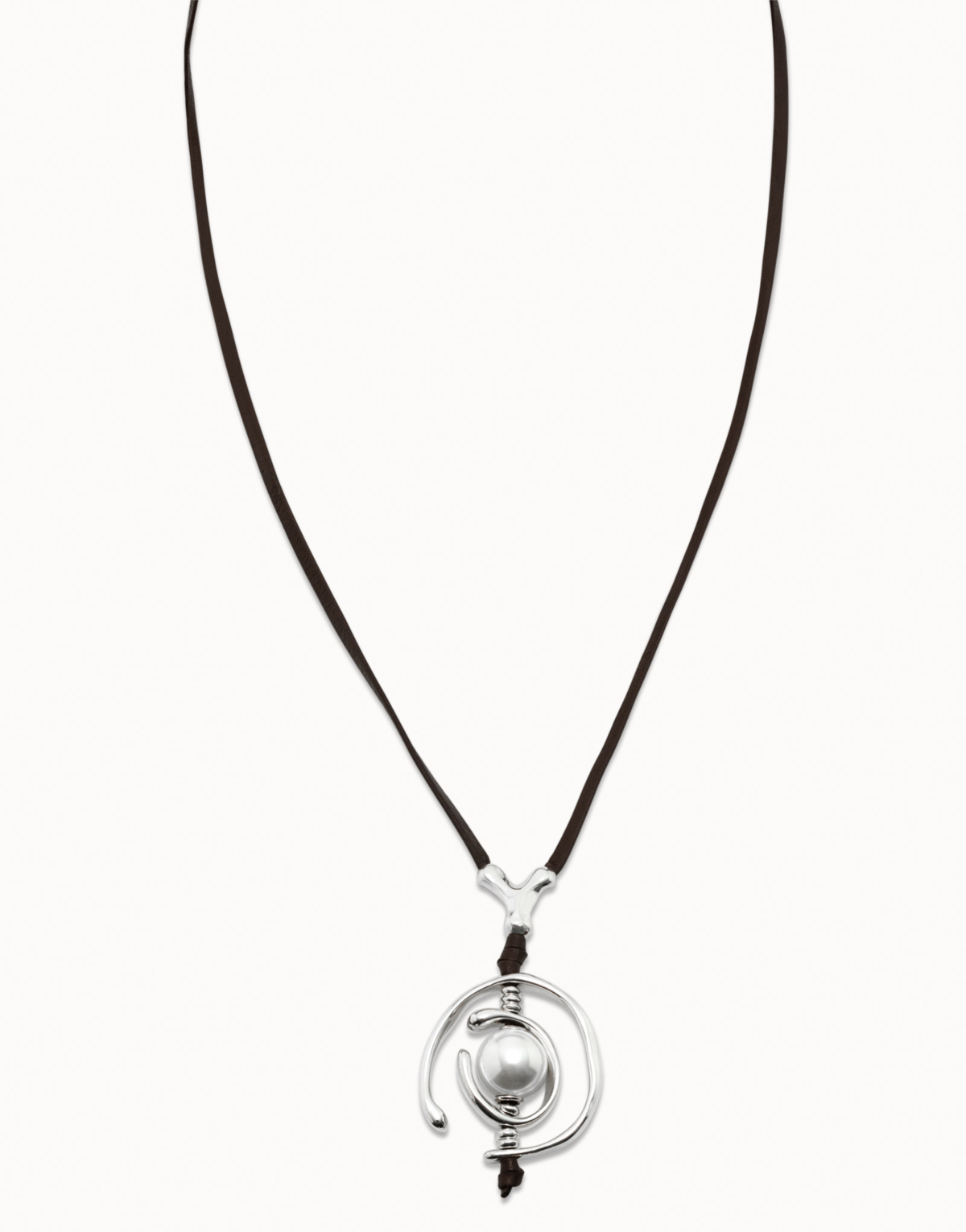 Collana donna uno de 50, COL0973BPLMAR0U, collezione sterling, Collana lunga di cuoio marrone che combina una perla bianca all’interno di una sfera in argento.
