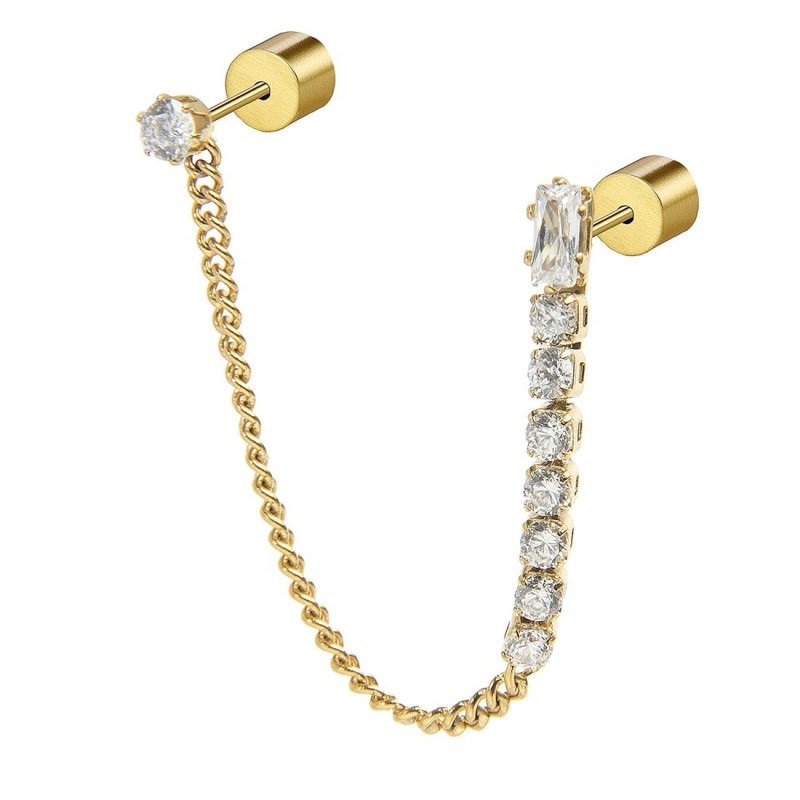Monorecchino multindosso donna marlù, 31OR0003G-W, collezione sparkles, in acciaio dorato Formato da una catena a tennis con cubic zirconia, al cui vertice si trova un cubic zirconia a baguette, e da una catena a grumetta nella cui parte finale si trova il secondo orecchino, removibile, con cubic zirconia con diametro 3 mm.